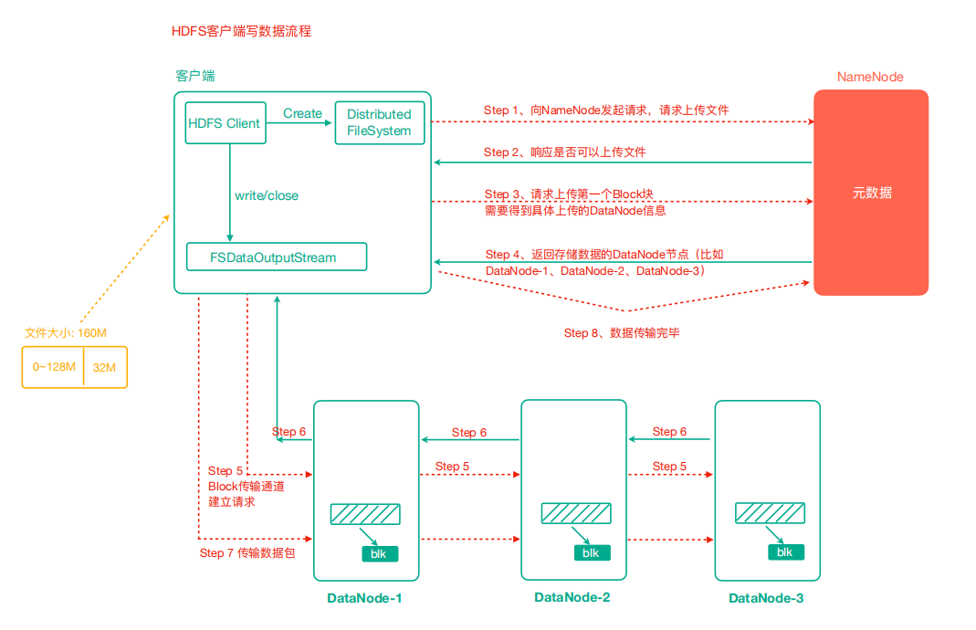 - 当一个Block传输完成之后,客户端再次请求NameNode上传第二个Block的服务器。(重复执行3-7步)。
