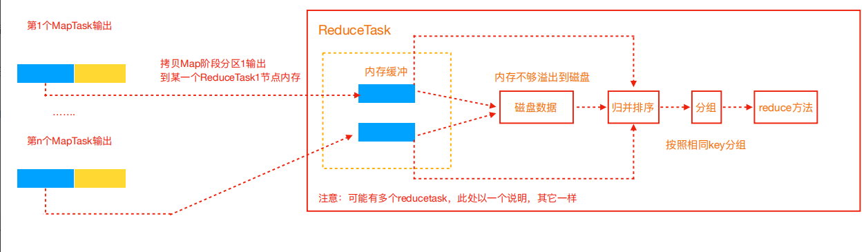 - Copy阶段,简单地拉取数据。Reduce进程启动一些数据copy线程(Fetcher),通过HTTP方式请求maptask获取属于自己的文件。
