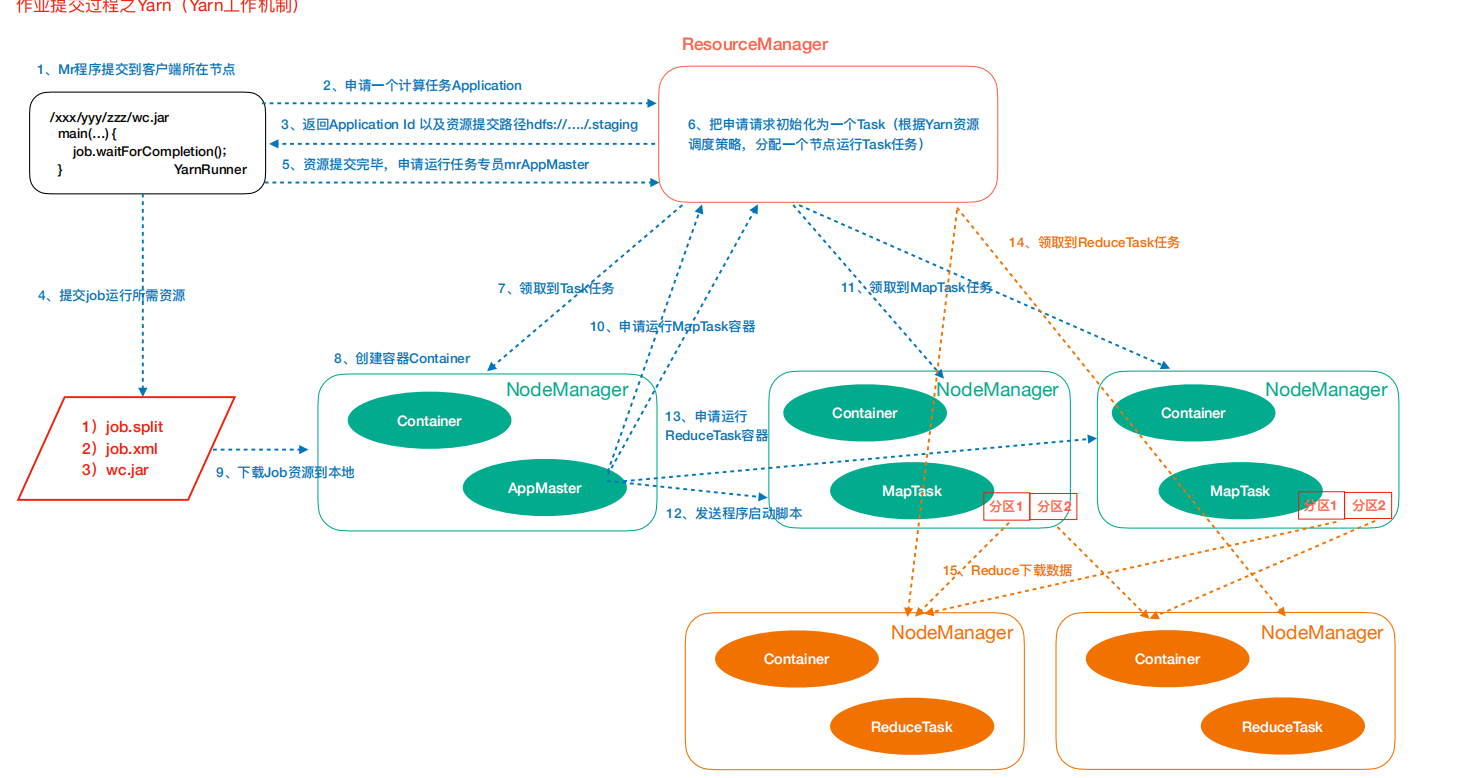 作业提交过程之 YARN作业提交第 1 步: Client 调用 job.waitForCompletion 方法,向整个集群提交 MapReduce 作业。第 2 步: Client 向 RM 申请一个作业 id 。第 3 步: RM 给 Client 返回该 job 资源的提交路径和作业 id 。第 4 步: Client 提交 jar 包、切片信息和配置文件到指定的资源提交路径。第 5 步: Client 提交完资源后,向 RM 申请运行 MrAppMaster 。作业初始化第 6 步:当 RM 收到 Client 的请求后,将该 job 添加到容量调度器中。第 7 步:某一个空闲的 NM 领取到该 Job 。第 8 步:该 NM 创建 Container ,并产生 MRAppmaster 。第 9 步:下载 Client 提交的资源到本地。任务分配第 10 步: MrAppMaster 向 RM 申请运行多个 MapTask 任务资源。第 11 步: RM 将运行 MapTask 任务分配给另外两个 NodeManager ,另两个 NodeManager 分别领取任务并创建容器。任务运行第 12 步: MR 向两个接收到任务的 NodeManager 发送程序启动脚本,这两个 NodeManager分别启动 MapTask , MapTask 对数据分区排序。第 13 步: MrAppMaster 等待所有 MapTask 运行完毕后,向 RM 申请容器,运行 ReduceTask 。第 14 步: ReduceTask 向 MapTask 获取相应分区的数据。第 15 步:程序运行完毕后, MR 会向 RM 申请注销自己。进度和状态更新YARN 中的任务将其进度和状态返回给应用管理器 , 客户端每秒 ( 通过mapreduce.client.progressmonitor.pollinterval 设置 ) 向应用管理器请求进度更新 , 展示给用户。作业完成除了向应用管理器请求作业进度外 , 客户端每 5 秒都会通过调用 waitForCompletion() 来检查作业是否完成。时间间隔可以通过 mapreduce.client.completion.pollinterval 来设置。作业完成之后 , 应用管理器和 Container 会清理工作状态。作业的信息会被作业历史服务器存储以备之后用户核查。