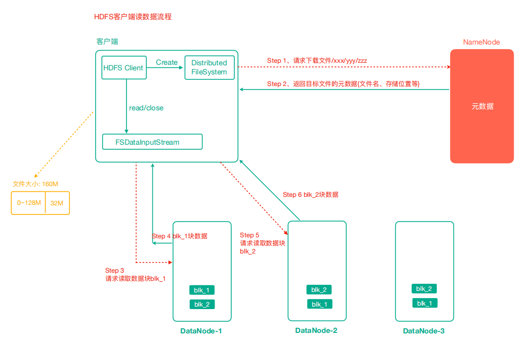 - 客户端通过Distributed FileSystem向NameNode请求下载文件,NameNode通过查询元数据,找到文件块所在的DataNode地址。