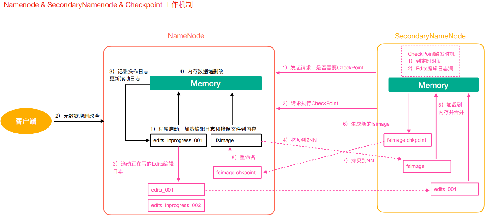 - 将滚动前的编辑日志和镜像文件拷贝到Secondary NameNode。