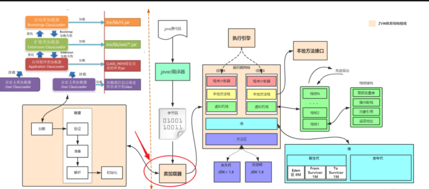 Java源文件 经过 javac编译 变成 字节码 通过 类加载器 加载