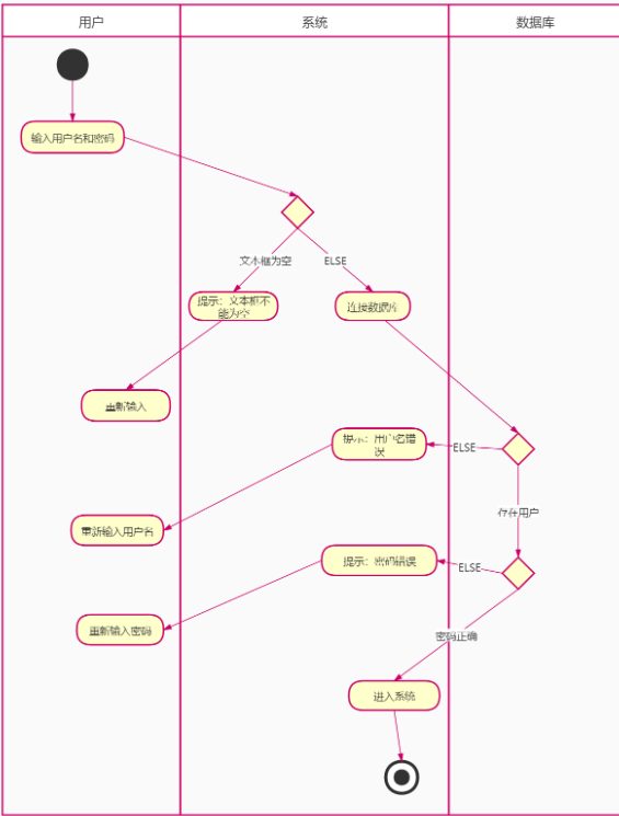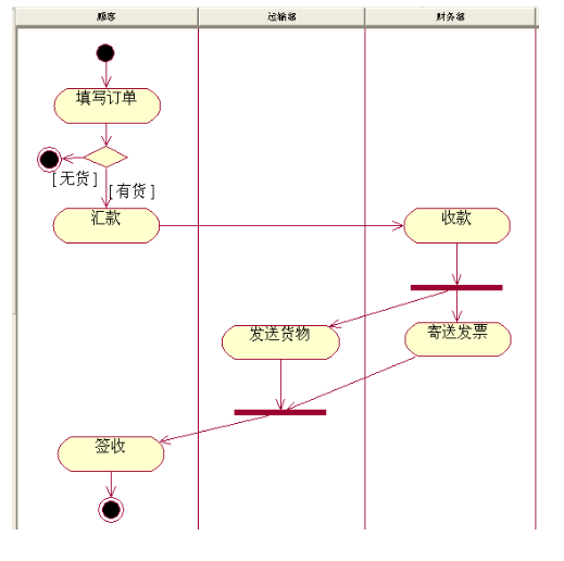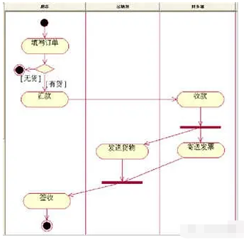6、泳道:将一个活动图中的活动状态分组,每一组表示一个特定的类、人或部门,它们负责完成组内的活动。每个活动都明确属于一个泳道,不可以跨越泳道,但是转移则可以跨越泳道。