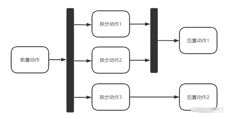 fork、join节点与上面的决策、合并节点类似,都是将一个流程分叉成多个子流程链路,最终再合并到一起,不同的是,fork节点分叉出的子流程是并行执行的,也就是异步操作。join节点也很好理解,就是在某个位置等待所有异步执行的流程都执行完毕后,再合并成同一个流程运行。