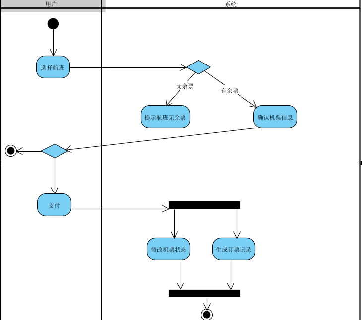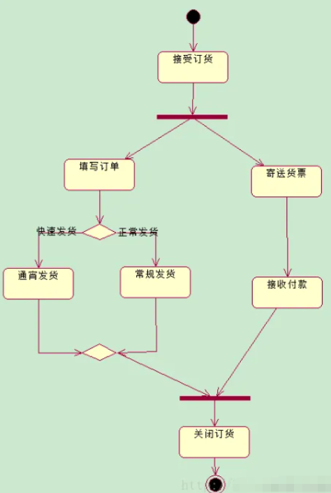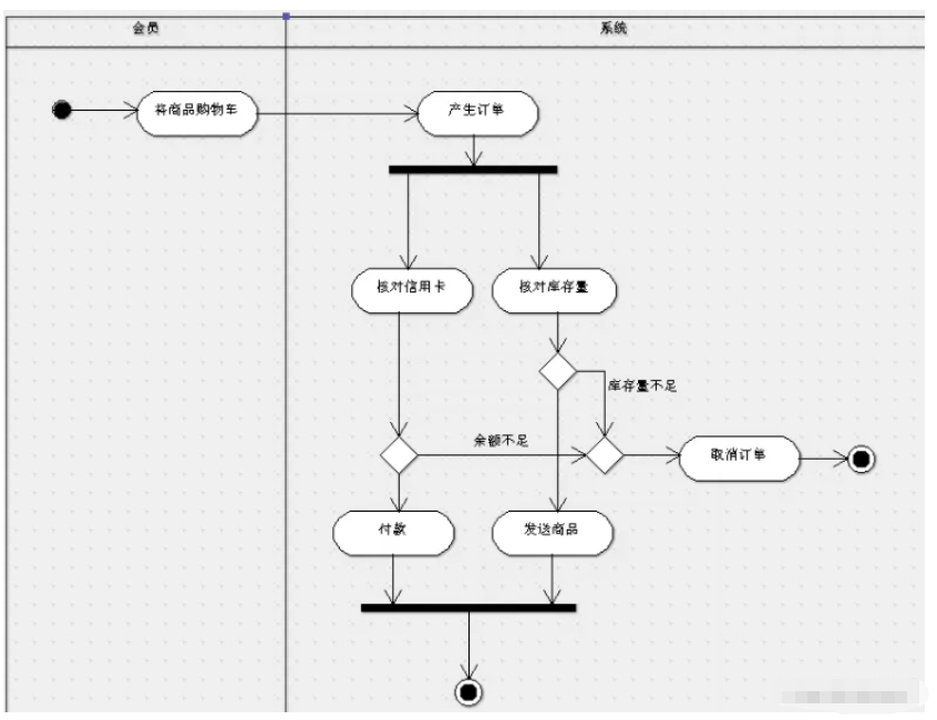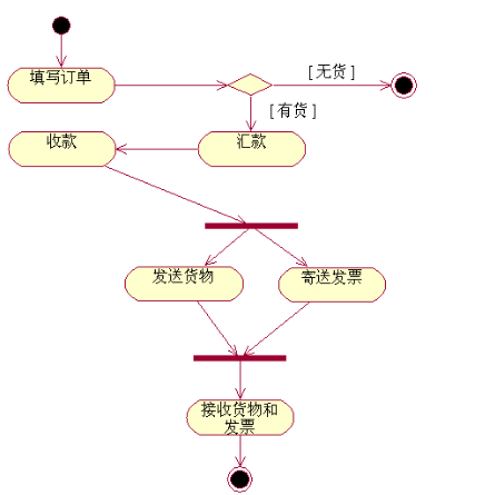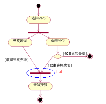 5、分叉与汇合:表示系统或对象中的并发行为。分叉表示把一个单独的控制流分成两个或多个并发的控制流。汇合表示两个或多个并发控制流的同步发生,当所有的控制流都达到汇合点后,控制才能继续往下进行。