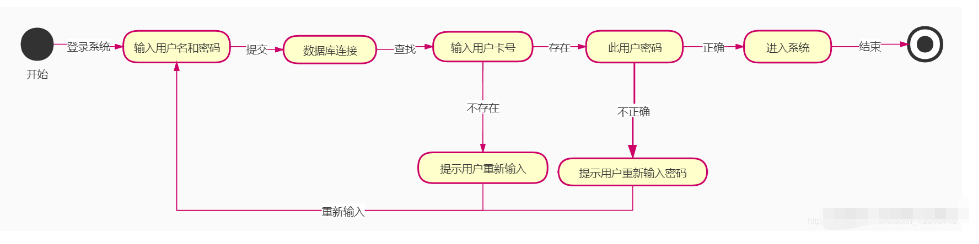 3、状态转移(State Transition):用带箭头的实线表示,表示从一个活动到另一个活动的转移。