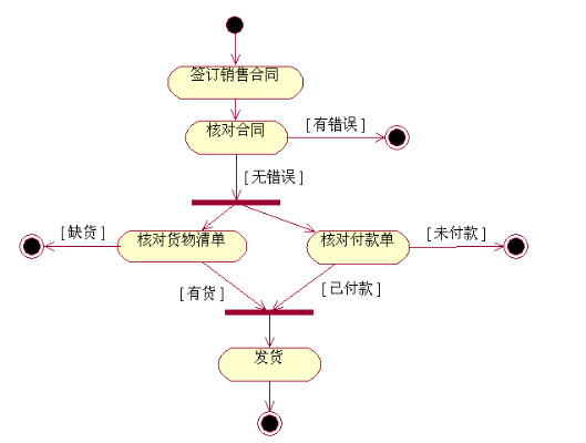 销售合同签订后,要进行核对。如果发现错误,则终止履约;如果没有错误,则要核对货物清单确定是否有货,还要核对付款单确定对方是否已经付款,只有这两项都完成,才可以发货。如果无货或对方尚未付款,则终止履约。则活动图如下: