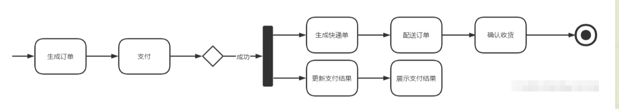 在购买商品的流程中,用户支付成功之后需要修改支付订单的状态为成功,同时需要生产快递单以进行配送,这两个动作可以并行执行,则可以表示为: