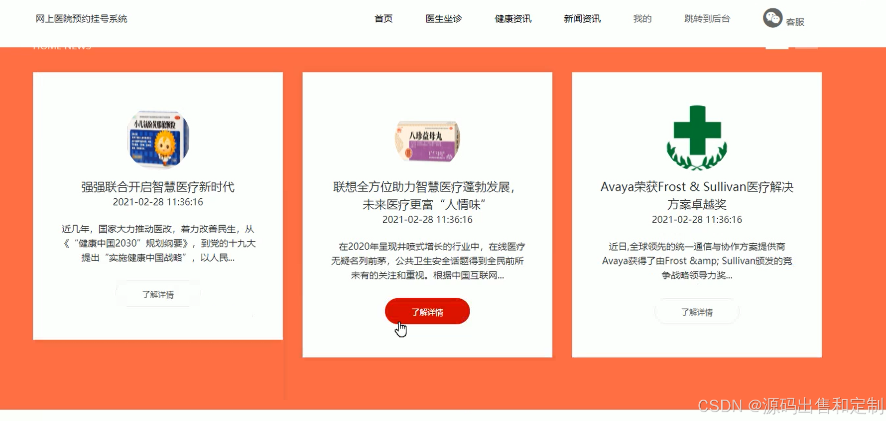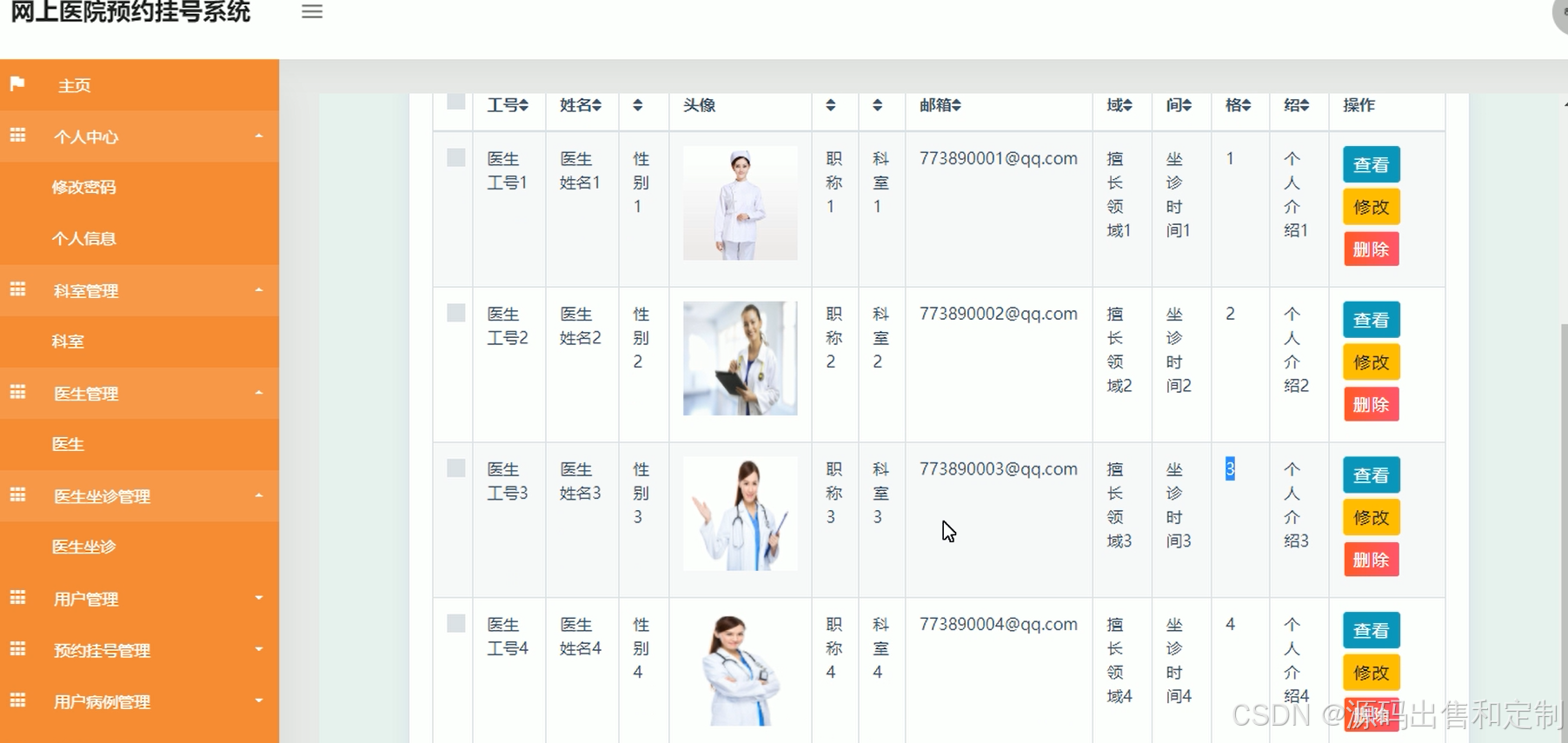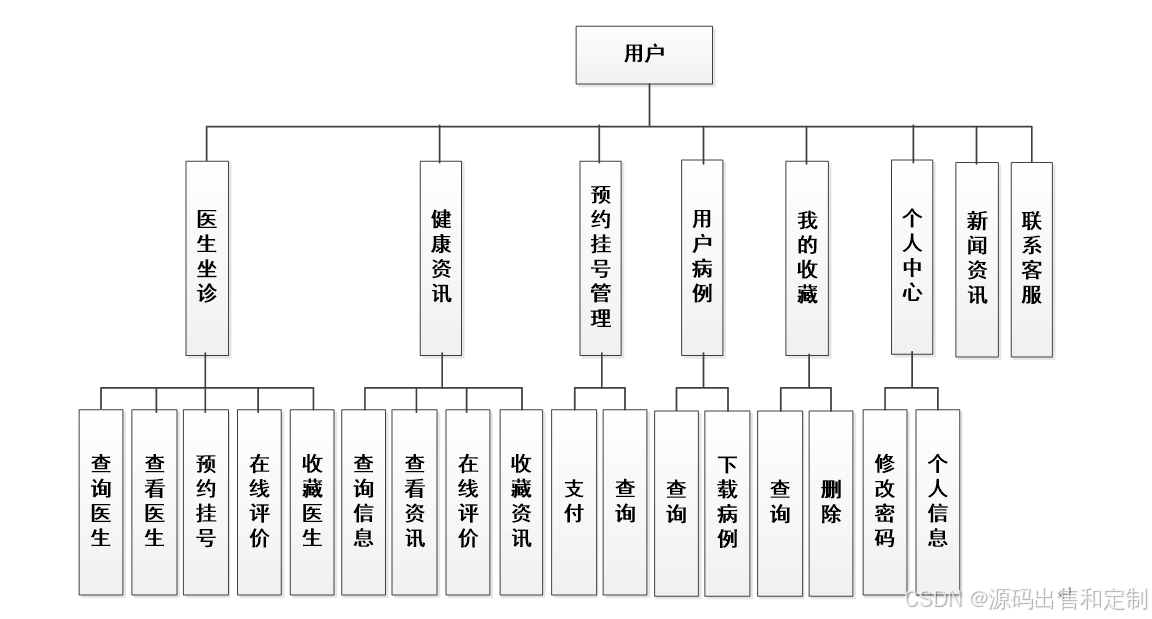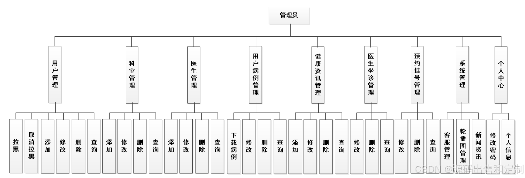 网上医院预约挂号系统根据调研,确定管理员除了管理医生,科室和用户外,也能管理用户预约挂号信息,下载用户病例,发布健康资讯,管理客服聊天信息。医生管理本人的坐诊信息,审核预约挂号,管理用户就诊病例。用户在前台查看医生坐诊,对医生预约挂号,评价并收藏医生,查看健康资讯,联系客服,用户在后台支付挂号价格,下载病例。