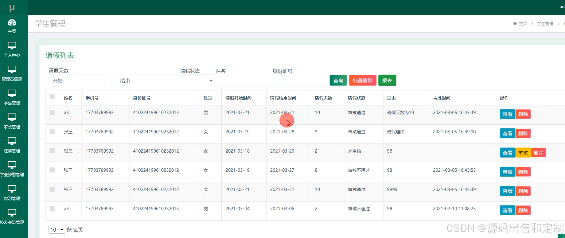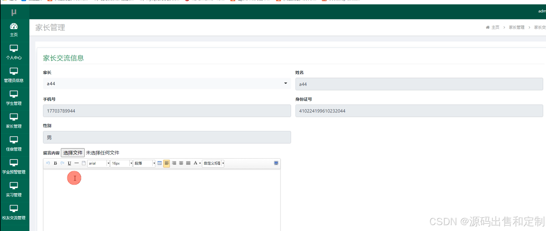 班主任助理系统采用JSP技术、Java语言和MySQL数据库,基于SSM框架设计开发,设计系统的基本功能,包括人员基本信息、请假统计、家长信息更新与交流、班会通知、成绩统计分析、住宿管理、学业预警(学业预警手工添加 学生端上可以看见预警)、毕业实习管理、毕业管理和校友交流等;