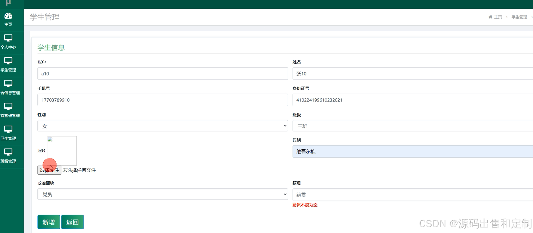 实现了学生基础数据的管理,宿舍信息管理,宿舍添加修改学生,卫生记录管理,班级管理等功能。