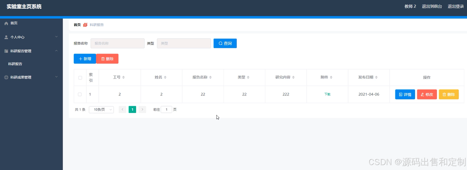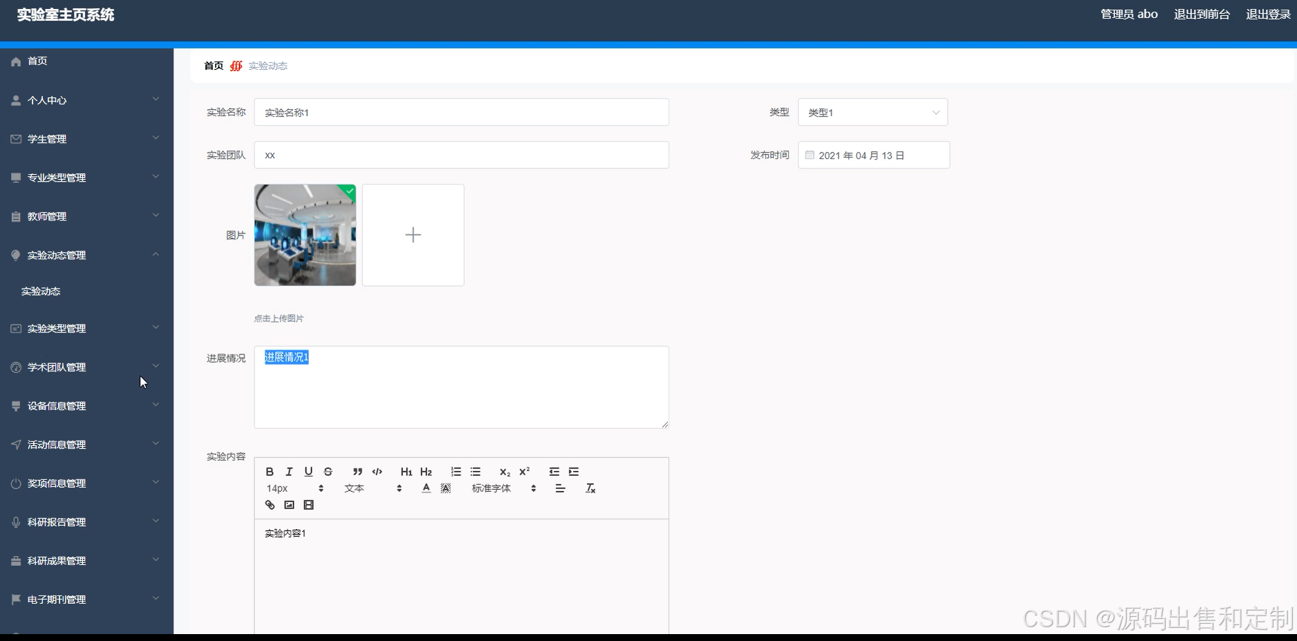 系统可以提供信息显示和相应服务,本系统管理员管理电子期刊,国际会议,学术团队以及实验动态,管理奖项和活动以及设备信息。教师管理科研报告,管理科研成果,下载国际会议资源,参与学术交流。学生下载科研成果,会议资源,电子期刊文件,查看学术交流里面的帖子并发布评论,查看学术团队,实验动态等信息。