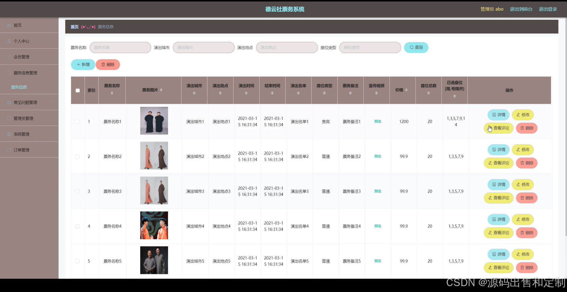 ②演出管理:添加演出、演出信息管理、生成演出座位信息、演出座位票价管理