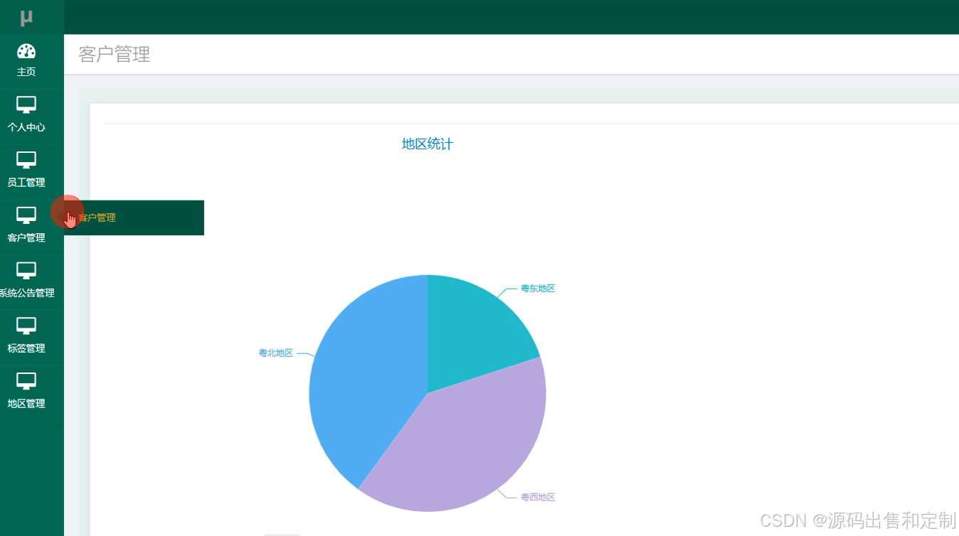 客户分析模块:此模块实时显示客户资料表中的统计数据,可根据新增的客户资料中的地区等属性统计数据,给人一种直观的感觉,能直接了解其趋势等。