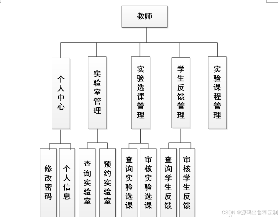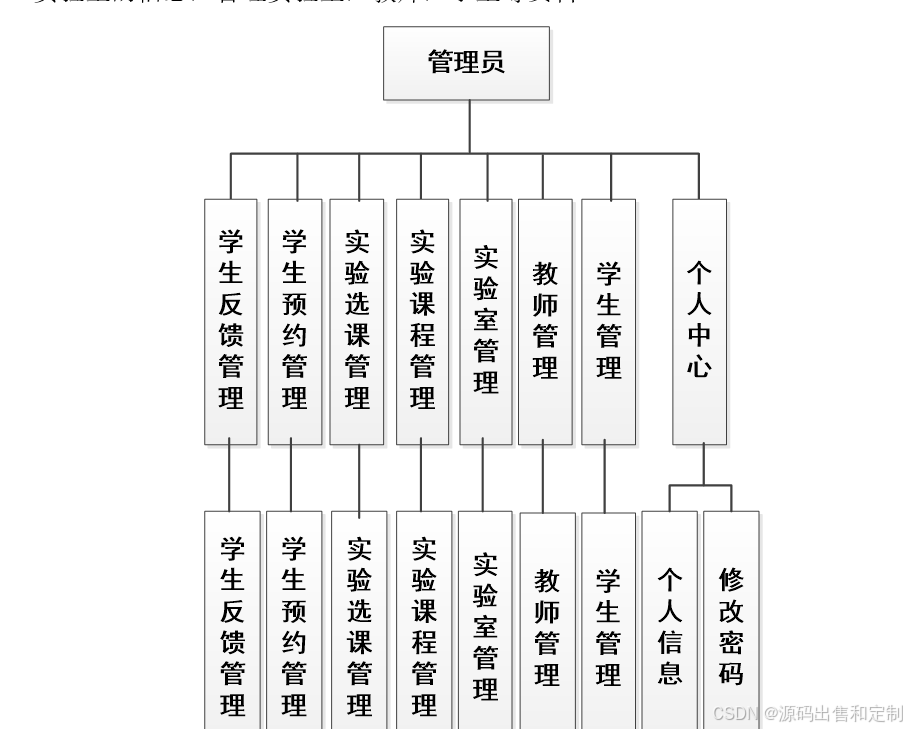 管理员模块:1、管理员登录 2、管理注册用户信息(教师、学生),包含学号/工号、密码、联系方式3、实验室资源管理(实验室的增删改查)4、掌握实验室分配使用情况(查看实验室是否被预订,查看实验室当前课程信息)5、管理任课教师的课程安排和学生的预订信息(审核预约信息)、管理计费系统(对学生个人实验室使用依据时长计费。合理即可);