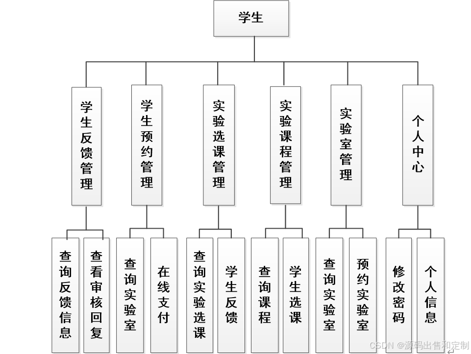 学生模块:1、注册(工号、密码、联系方式)、登录(不需验证码)2、用户信息查看与修改3、查看空闲实验室和剩余机位数量。4、完成实验选课(选取任课老师预订的课程)5、反馈实验信息(给任课老师)6、预约实验(自己课外时间去实验的,要收费,预约一个机位)7、实验计时收费