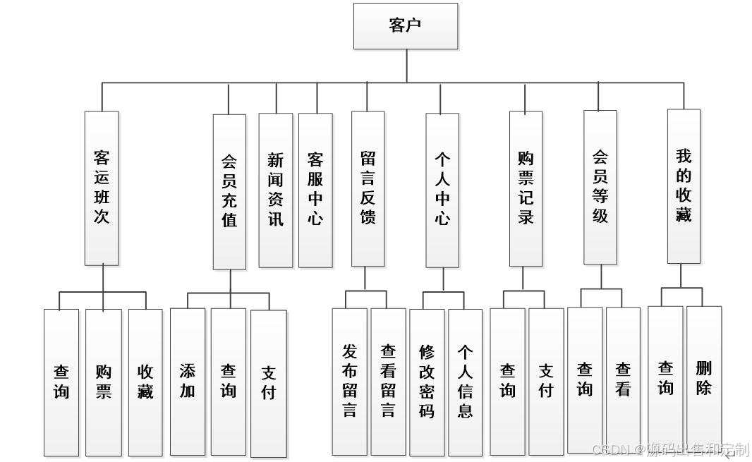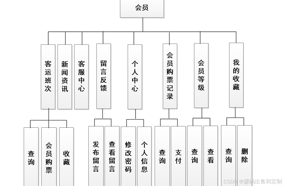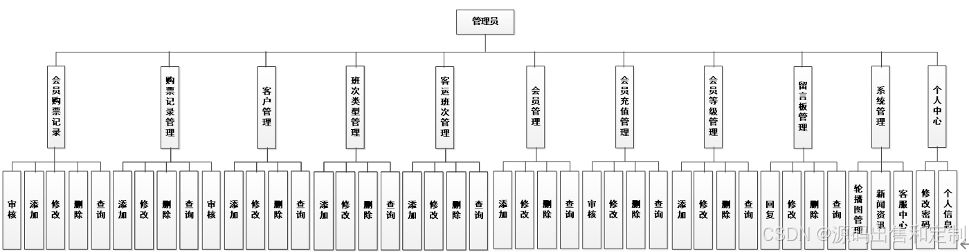 管理员负责审核会员充值,审核客户购票信息以及会员购票信息,管理客运班次与留言板,管理会员等级。客户查看客运班次,购买并支付车票,在前台联系客服,向管理员留言,在后台查看购票记录,进行会员充值。会员通过会员购票渠道进行购票,并在后台支付车票,查看购票审核情况,查看会员等级,管理收藏信息。