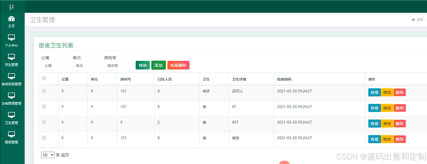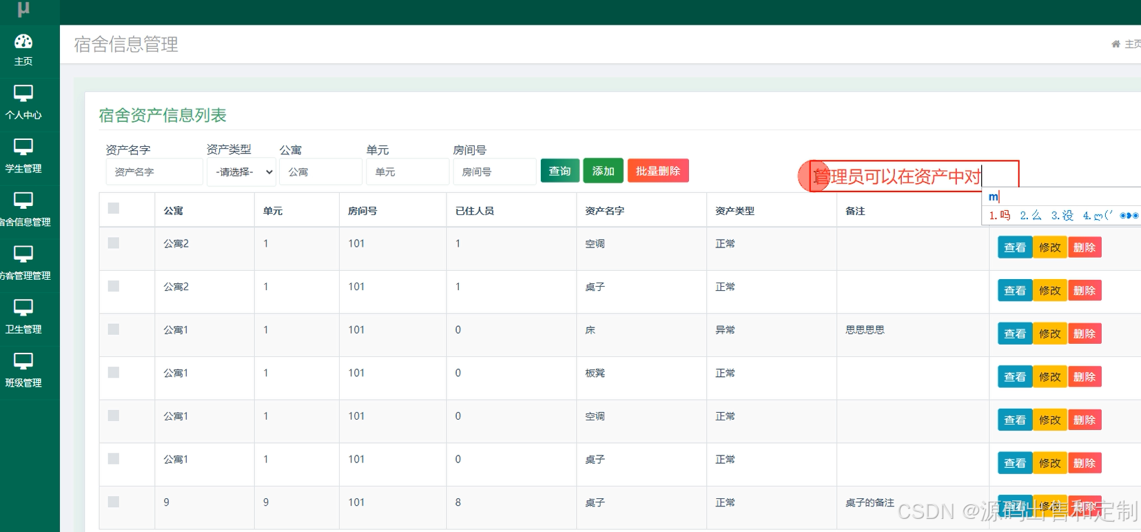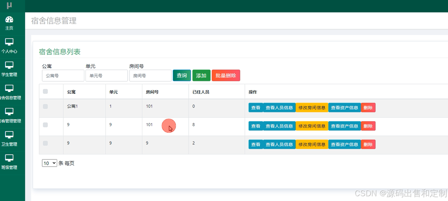 (3)提供宿舍信息管理,对每个公寓的宿舍信息进行统一的增删改查,以及不同的宿舍编号机制。