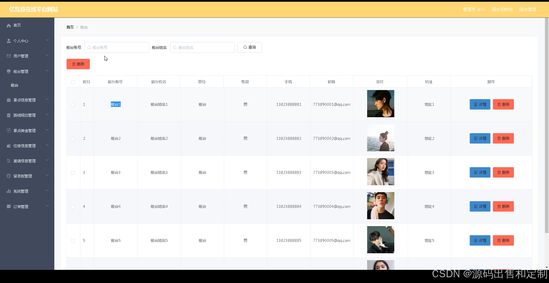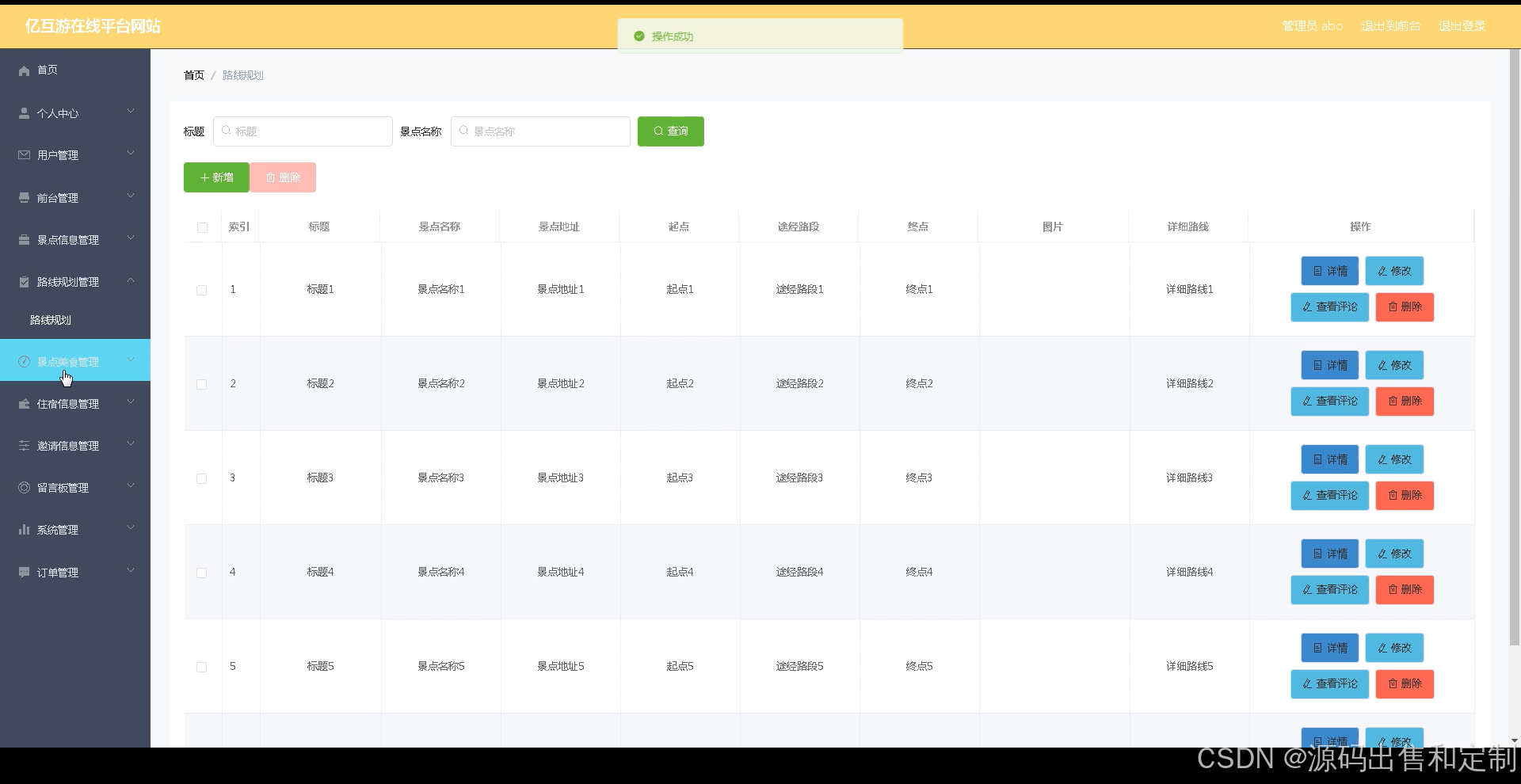 本文研究的亿互游在线平台基于SSM框架,采用JSP技术、Java语言和MYSQL数据库设计开发。通过本系统,满足了不同权限用户的需求,包括管理员、用户和前台,用户通过本系统可查看旅游信息,注册登录后还可进行酒店预订、美食购买等,前台注册登录后可实现景点信息管理、路线规划管理、景点美食管理以及住宿信息管理功能,管理员可登录系统后台对系统进行全面管理,确保系统正常稳定运行,更好的为用户服务。具体请看视频演示