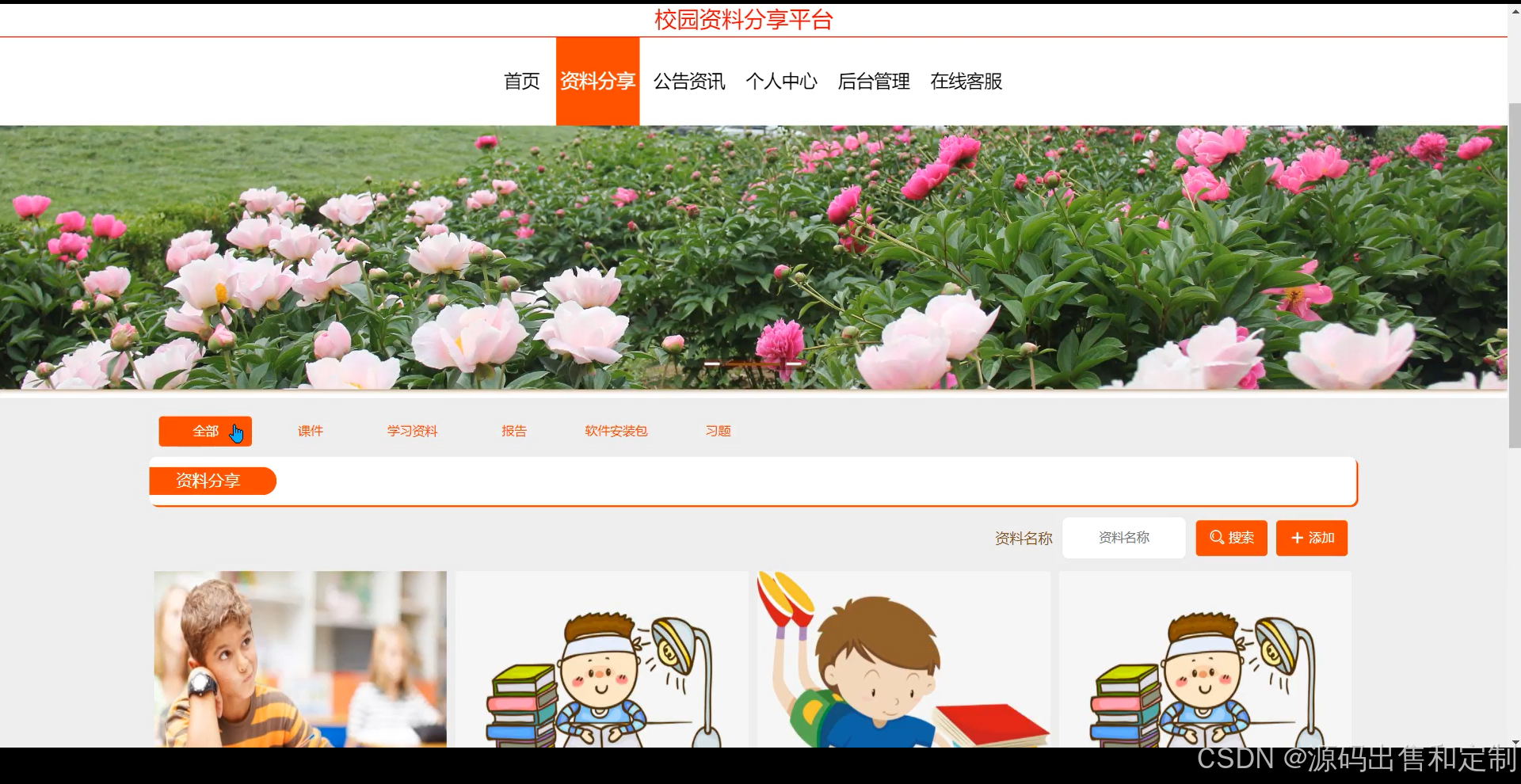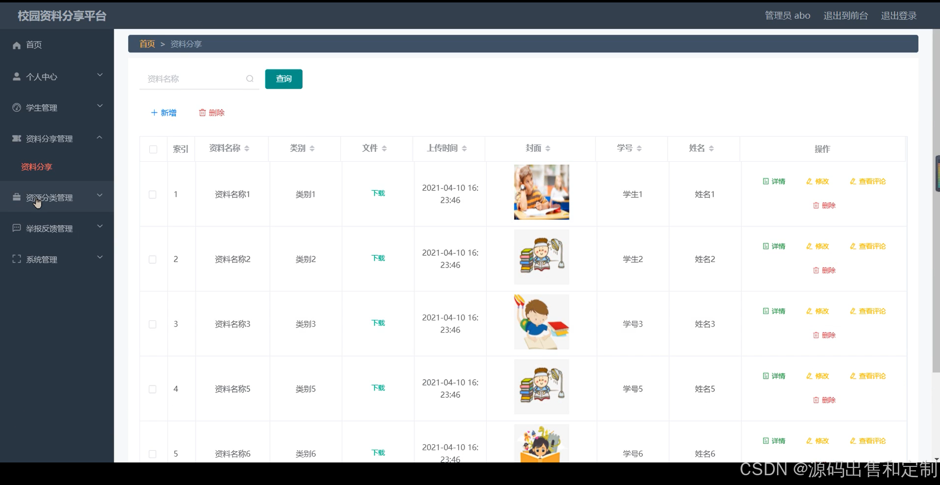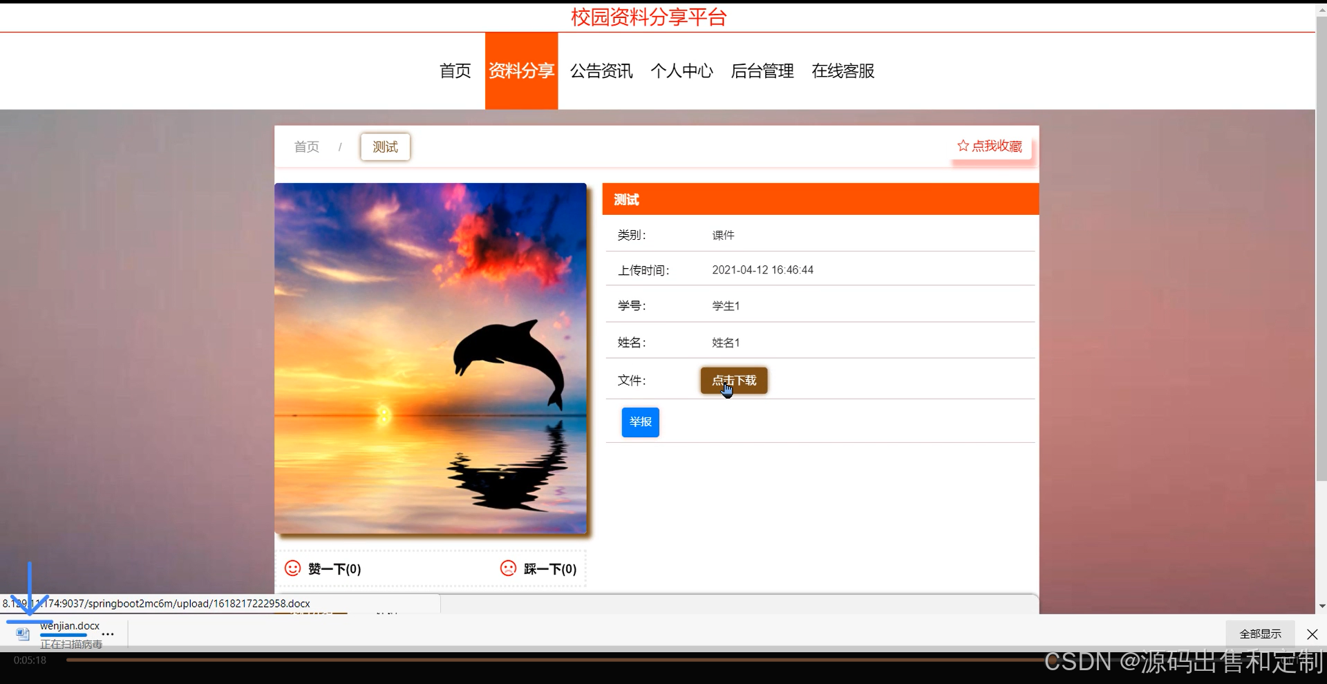 本校园资料分享平台有管理员和用户两个角色。管理员功能有个人中心,学生管理,资料分享管理,资源分类管理,举报反馈管理,系统管理等。用户功能有注册登录,个人中心,我的收藏,资料评论等。因而具有一定的实用性。具体请看视频演示