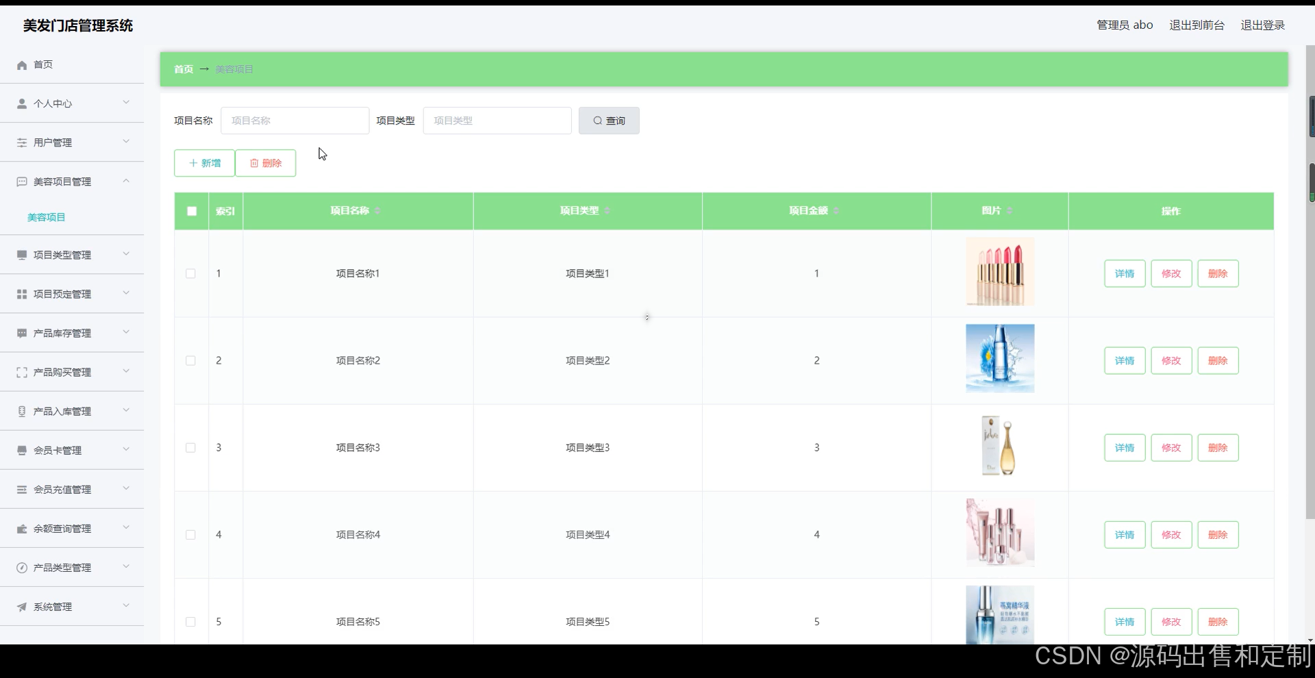 本美发门店管理系统有管理员和用户两个角色。用户功能有项目预定管理,产品购买管理,会员充值管理,余额查询管理。管理员功能有个人中心,用户管理,美容项目管理,项目类型管理,项目预定管理,产品库存管理,产品购买管理,产品入库管理,会员卡管理,会员充值管理,余额查询管理,产品类型管理,系统管理等。具体请看视频演示