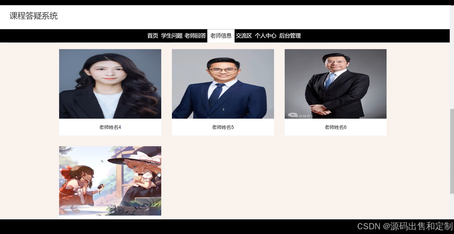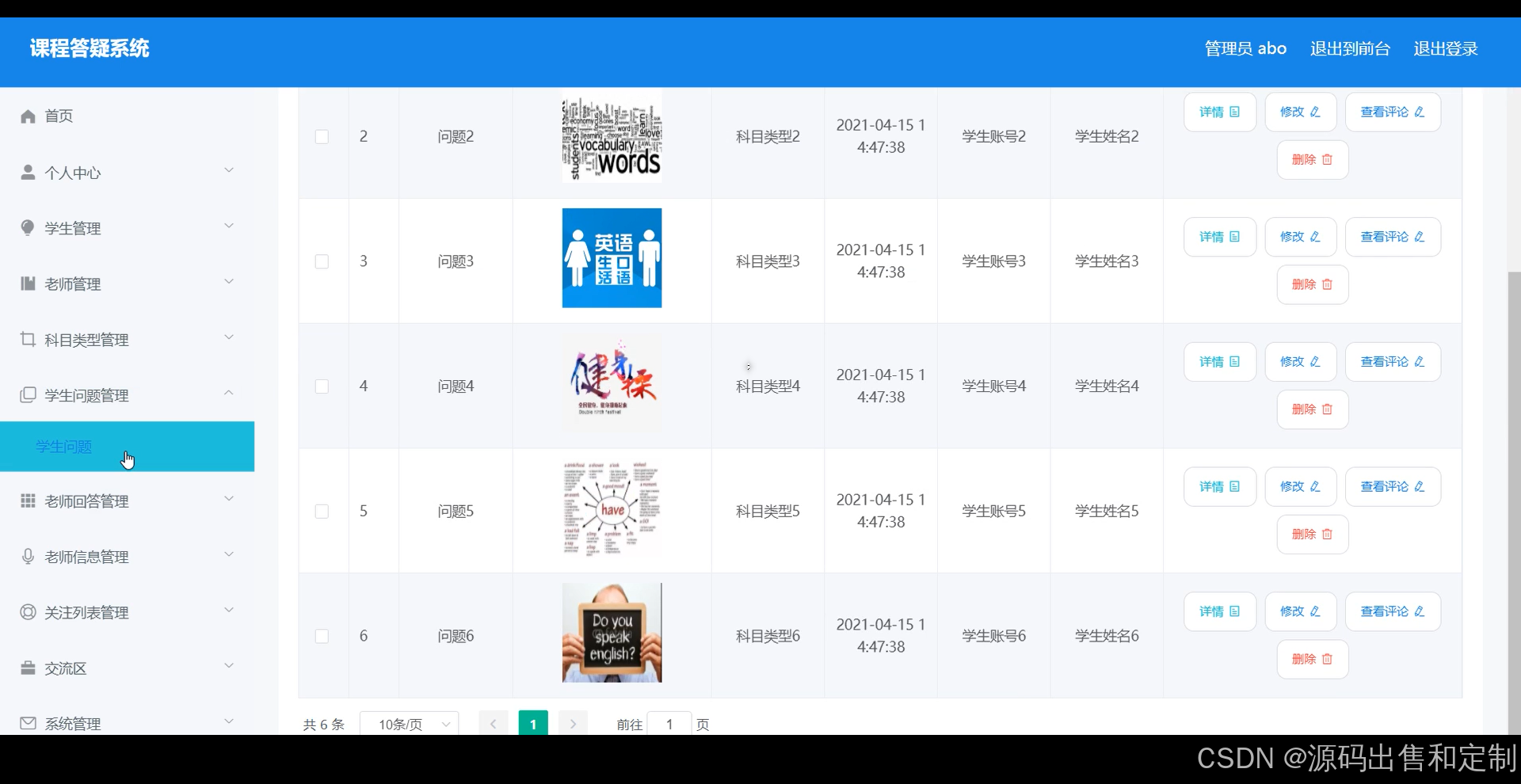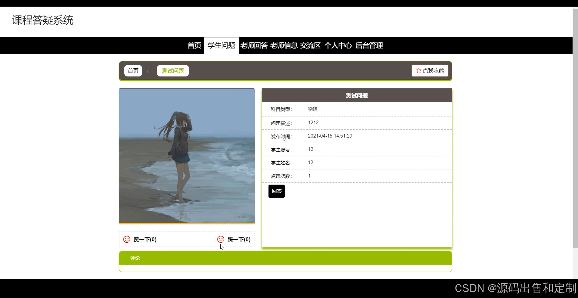 本课程答疑系统有管理员,老师,学生三个角色。管理员功能有,个人中心,学生管理,老师过来,科目类型管理,学生问题管理,老师回答管理,老师信息管理,关注列表管理,交流区,系统管理。学生功能有,个人中心,科目类型管理,学生问题管理,老师回答管理,老师信息管理,关注列表管理,我的收藏管理。老师功能有,个人中心,老师回答管理,老师信息管理,关注列表管理,我的收藏管理。具体请看视频演示