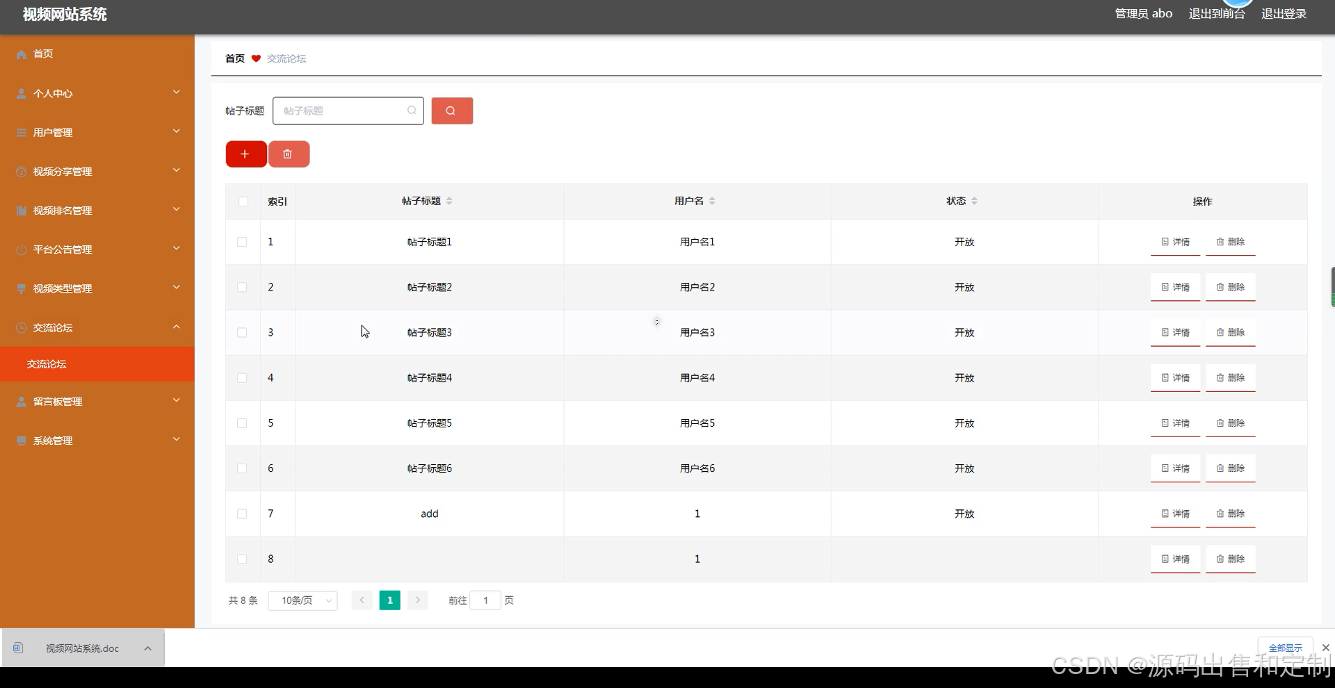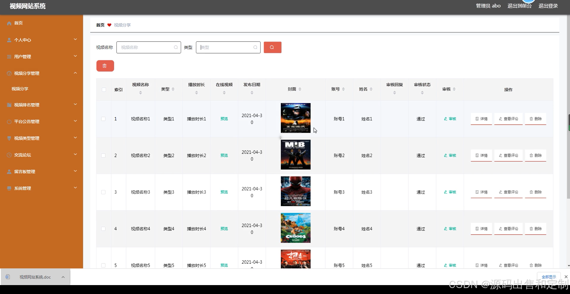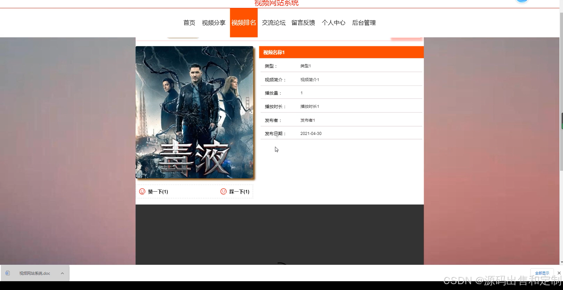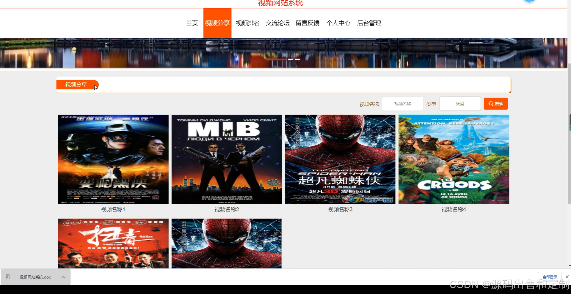这次开发的视频网站系统管理员功能有个人中心,用户管理,视频分享管理,视频排名管理,平台公告管理,视频类型管理,交流论坛管理,留言板管理,系统管理等。用户功能有个人中心和视频分享管理。具体请看视频演示