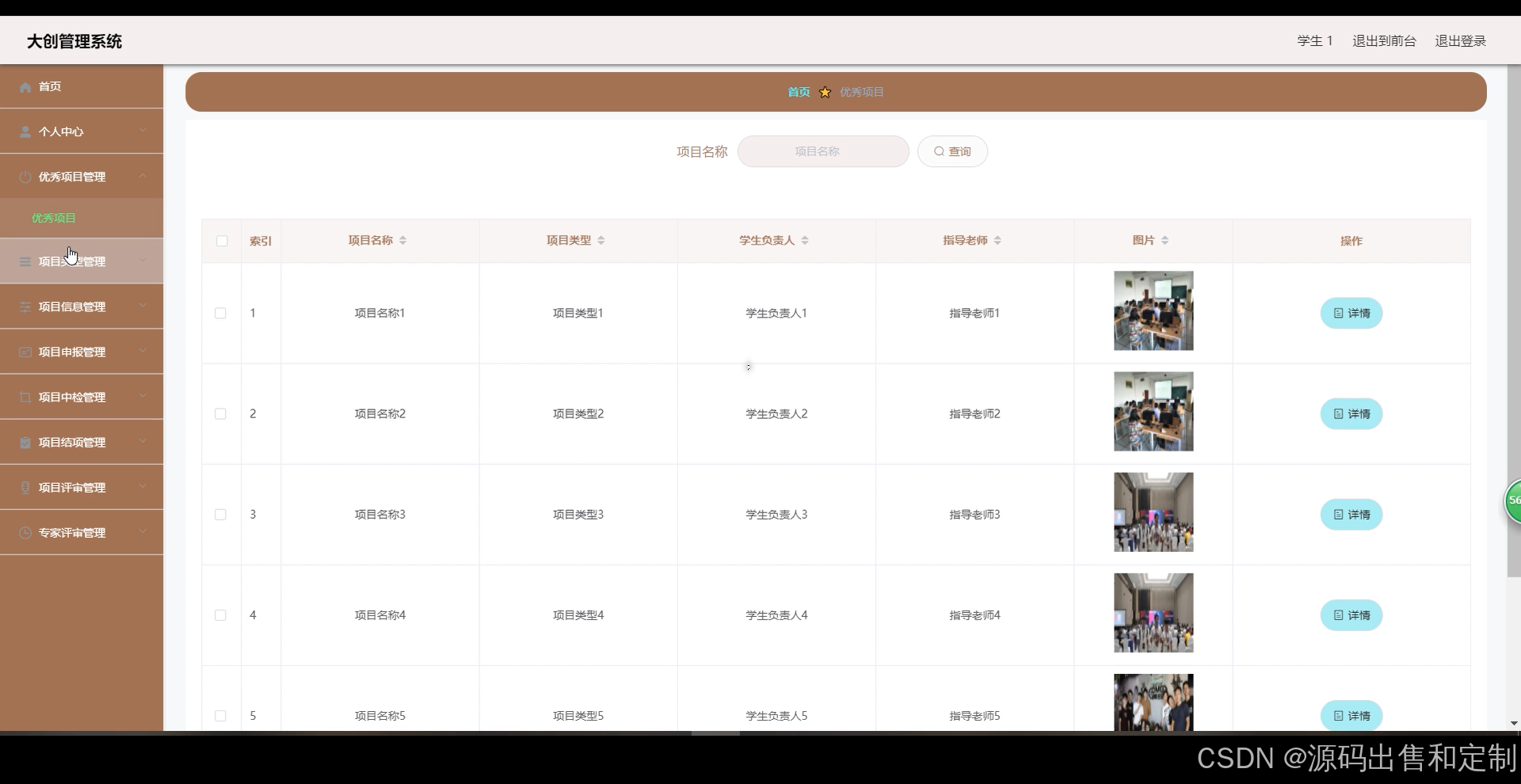 本大创管理系统有院系管理员,指导老师以及学生三个角色。学生功能有优秀项目,项目信息,评审方案,大创资讯,项目申报管理,项目中检管理,项目结项管理,项目评审管理,专家评审管理。指导老师功能有个人中心,优秀项目管理,项目类型管理,项目信息管理,项目申报管理,项目中检管理,项目结项管理,项目评审管理,专家评审管理,评审方案管理。院系管理员功能有个人中心,优秀项目管理,项目类型管理,项目信息管理,项目申报管理,项目中检管理,项目结项管理,项目评审管理,专家评审管理,评审方案管理。具体请看视频演示