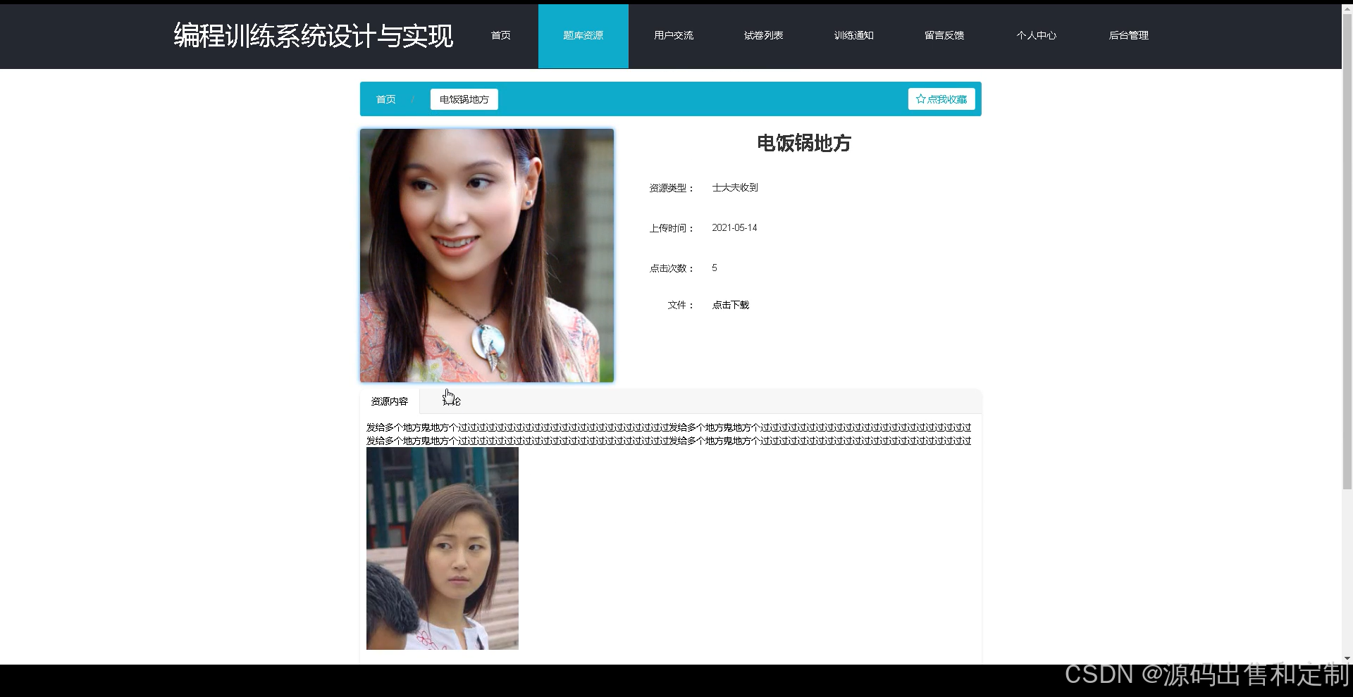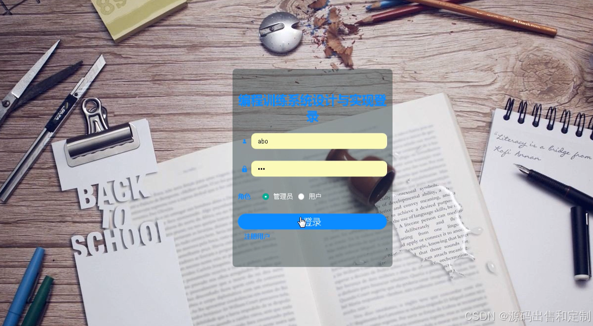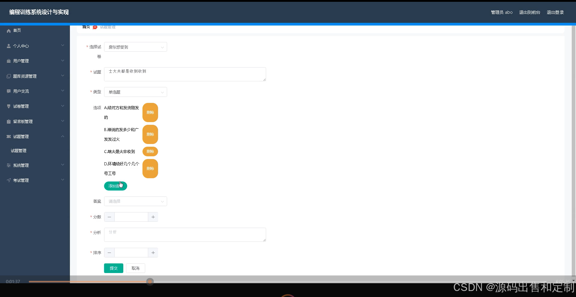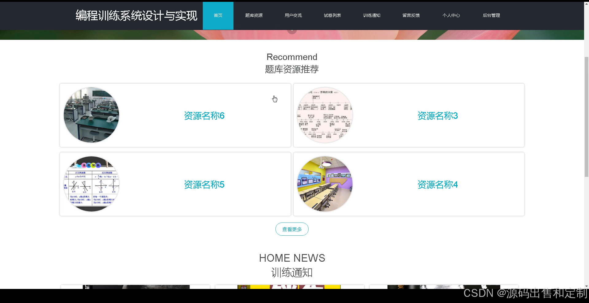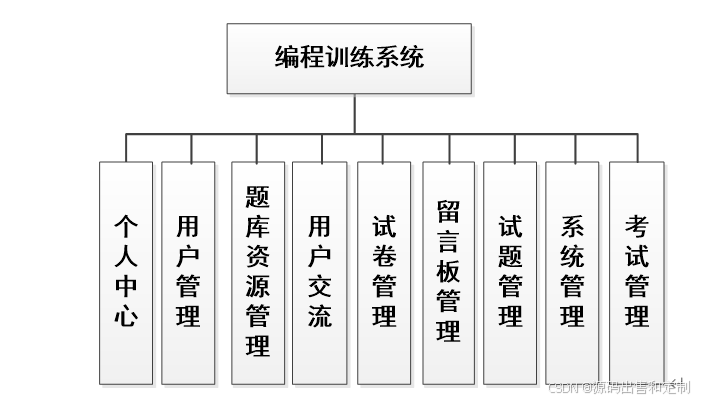 本编程训练系统管理员功能有管理员和用户。管理员功能有个人中心,用户管理,题库资源管理,用户交流,试卷管理,留言板管理,试题管理,系统管理,考试管理。用户可以查看题库资源,可以参加考试,进行留言等操作。具体请看视频演示