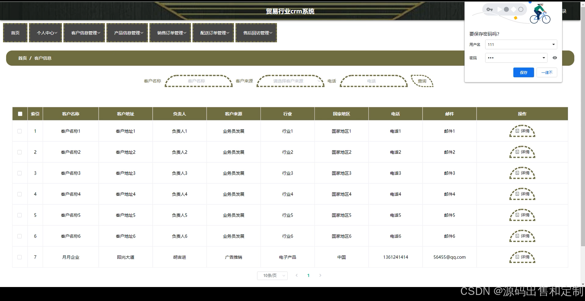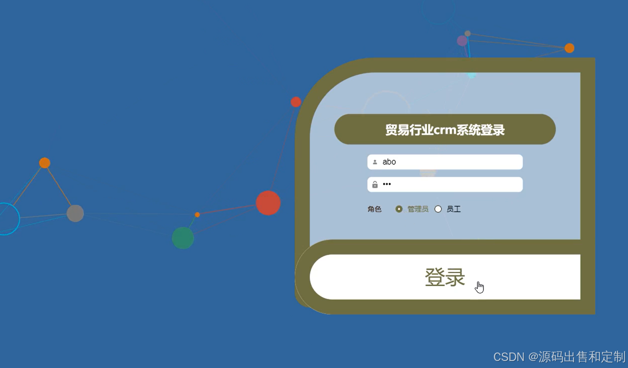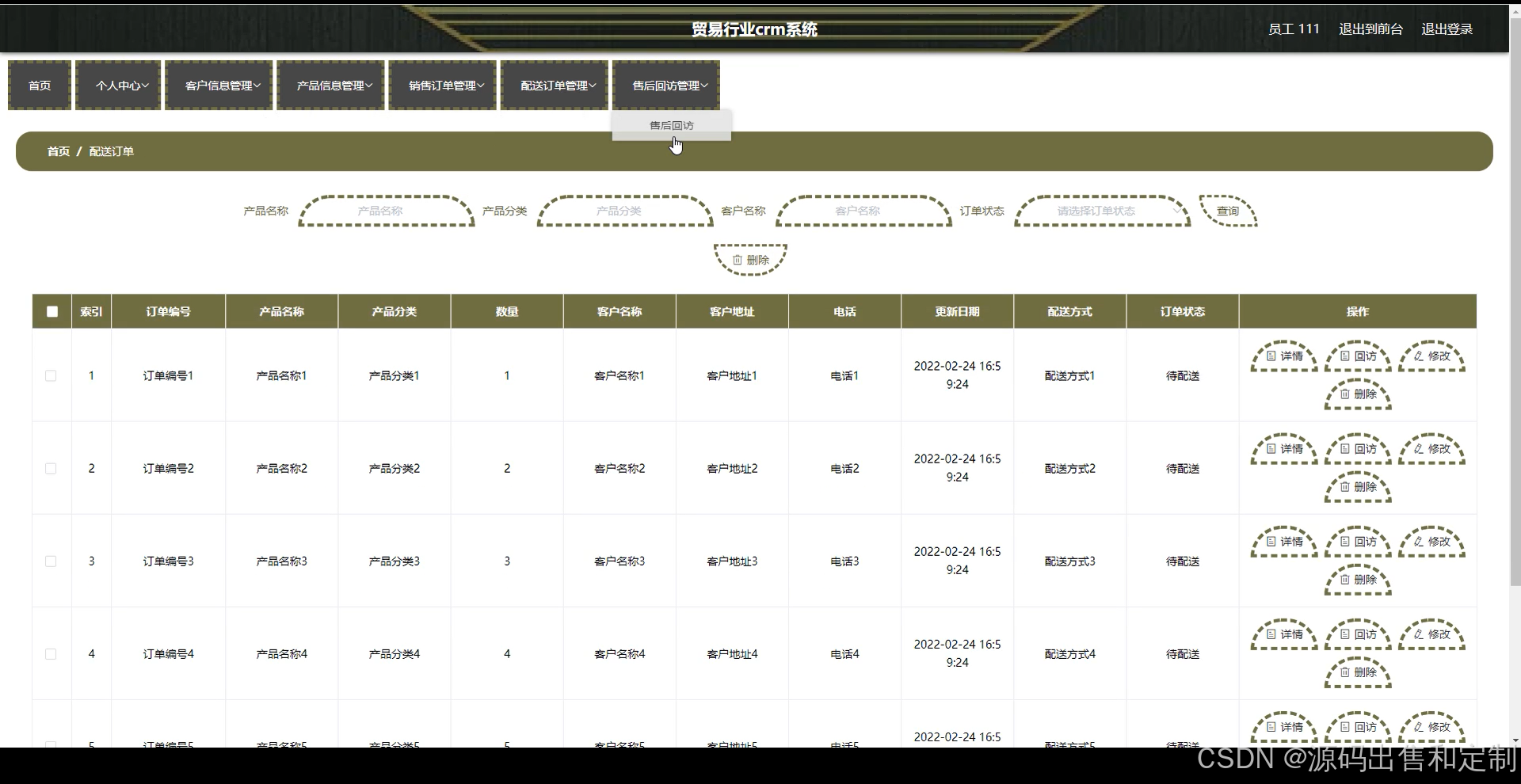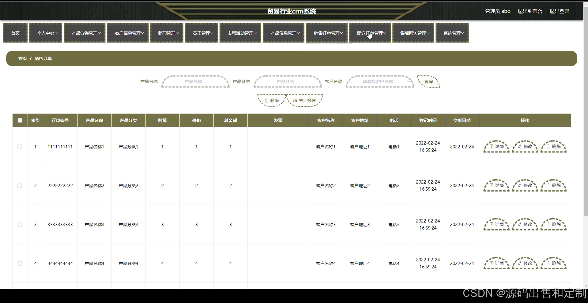 本基于springboot的贸易行业crm系统有管理员和员工两个角色。管理员功能有个人中心,部门管理,员工管理,产品分类管理,产品信息管理,客户信息管理,市场活动管理,销售订单管理,配送订单管理。员工可以操作自己的个人中心,客户信息,产品信息,销售订单,配送订单,售后回访等。具体请看视频演示