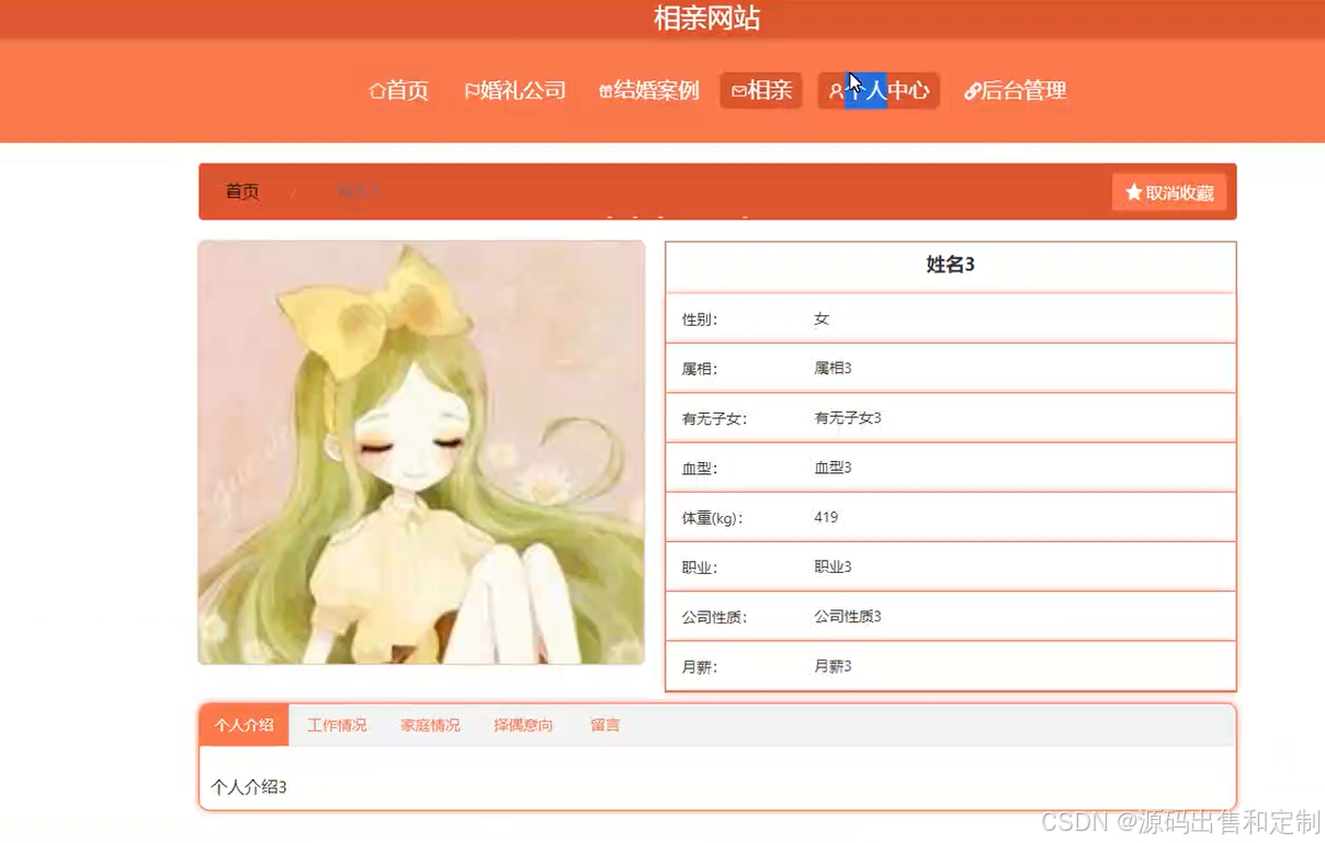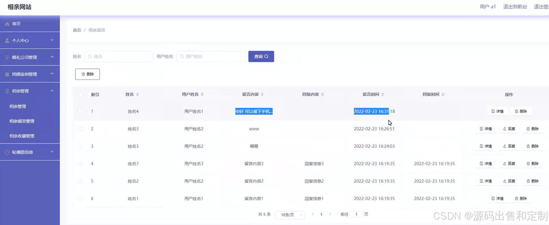 相亲网站可以实现婚礼公司管理,婚礼公司收藏管理, 婚礼公司预约管理,结婚案例管理,结婚案例收藏管理,用户管理,相亲管理,相亲留言管理,相亲收藏管理等功能。具体请看视频演示