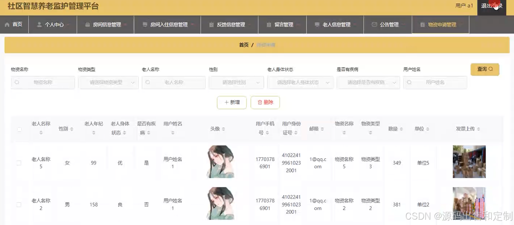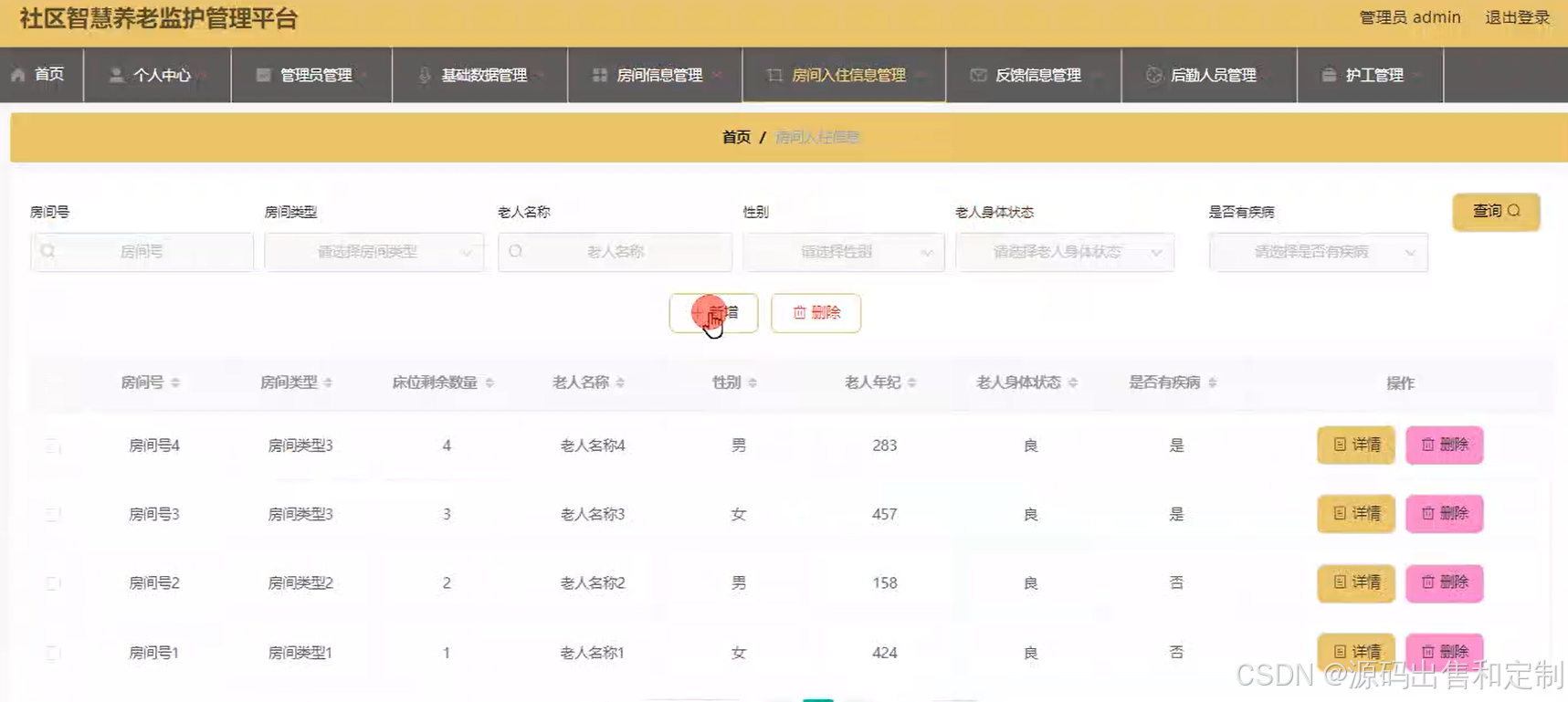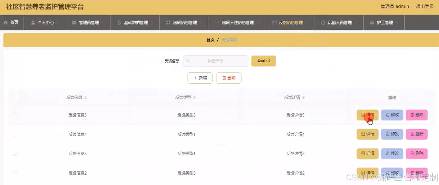社区智慧养老监护管理平台能够实现反馈信息管理,房间入住管理,老人信息管理,留言管理,物资申请管理,体检员管理,后勤人员管理,护工管理,房间管理等功能。具体请看视频演示