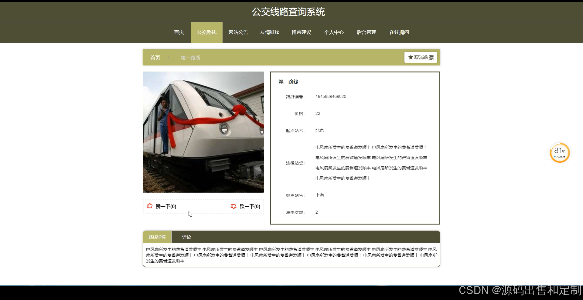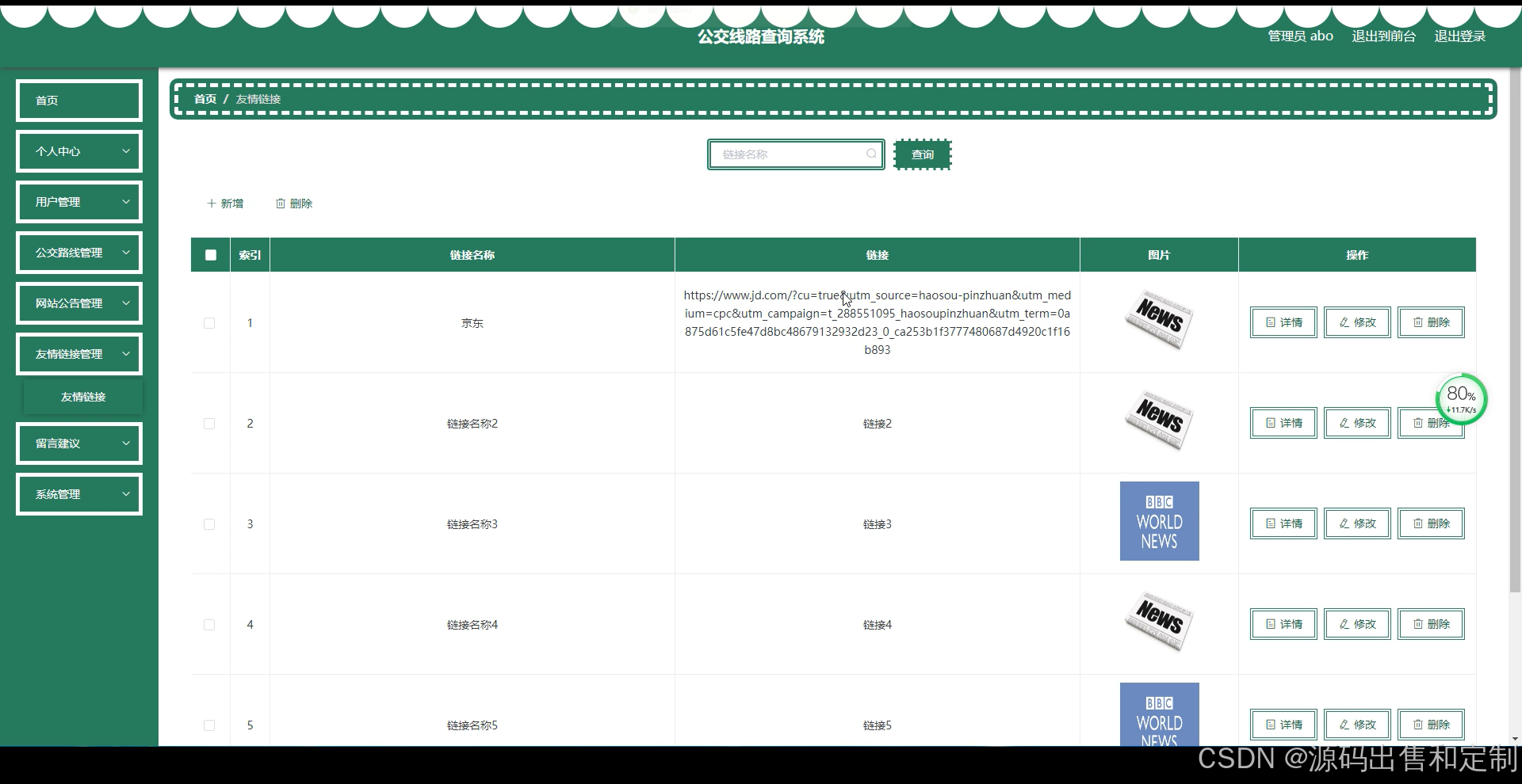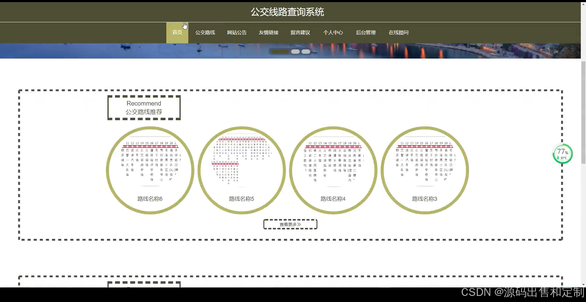 本次开发一套公交线路查询系统有管理员,用户两个角色。管理员功能有个人中心,用户管理,公交线路管理,网站公告管理,友情链接管理,留言管理,系统管理。用户可以注册登录,查看公告线路,查看网站公告,进行留言等操作。具体请看视频演示
