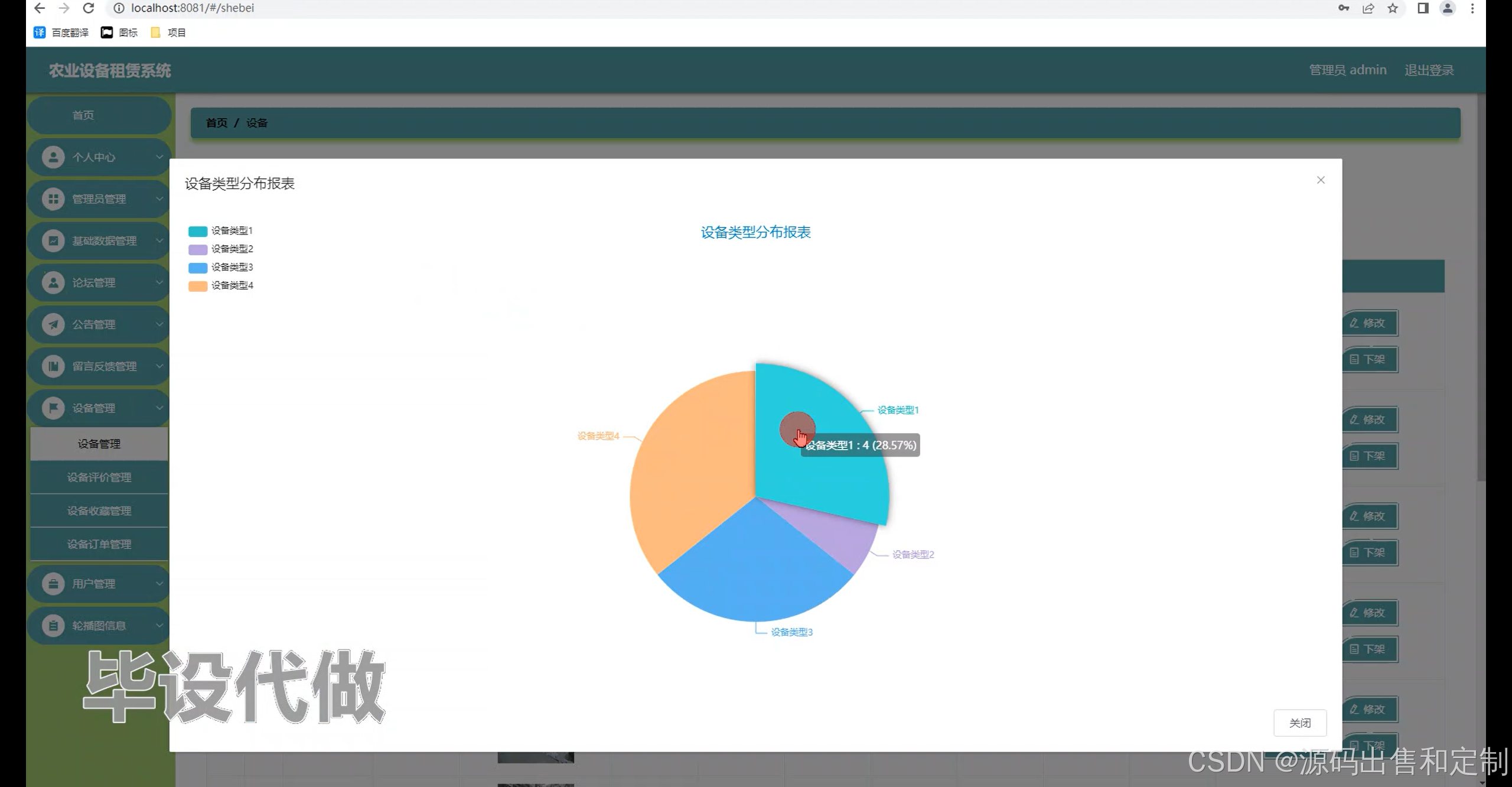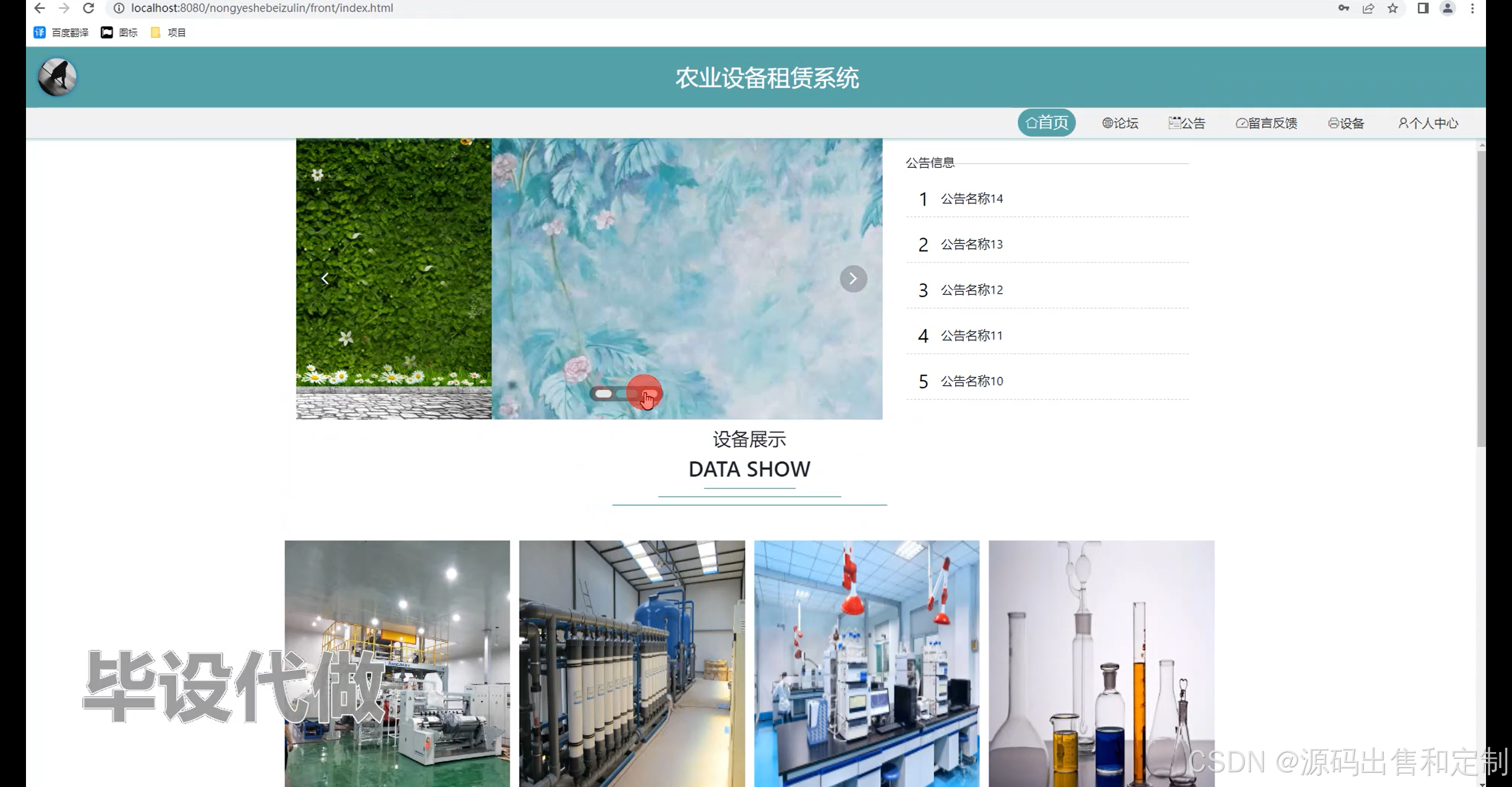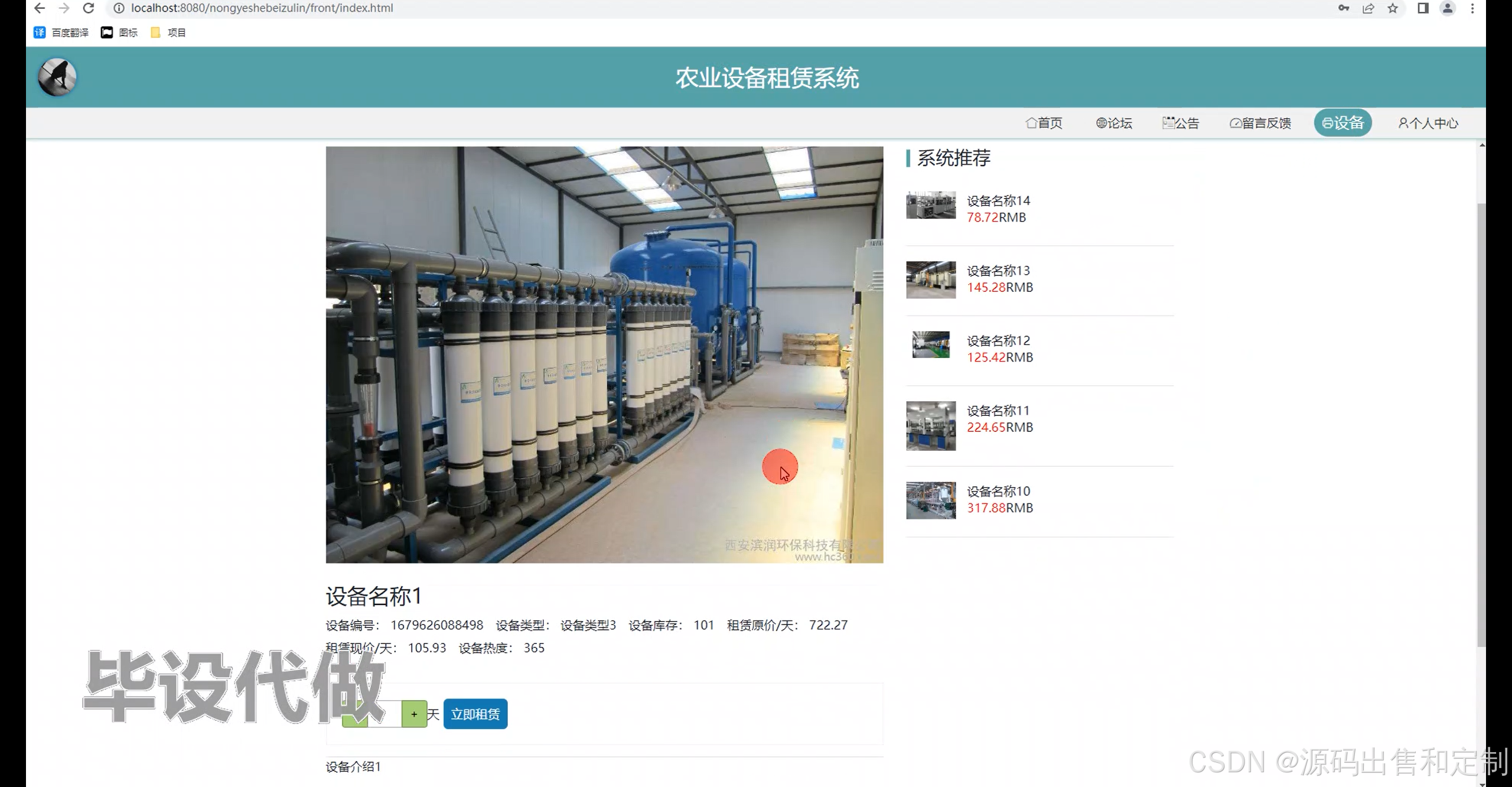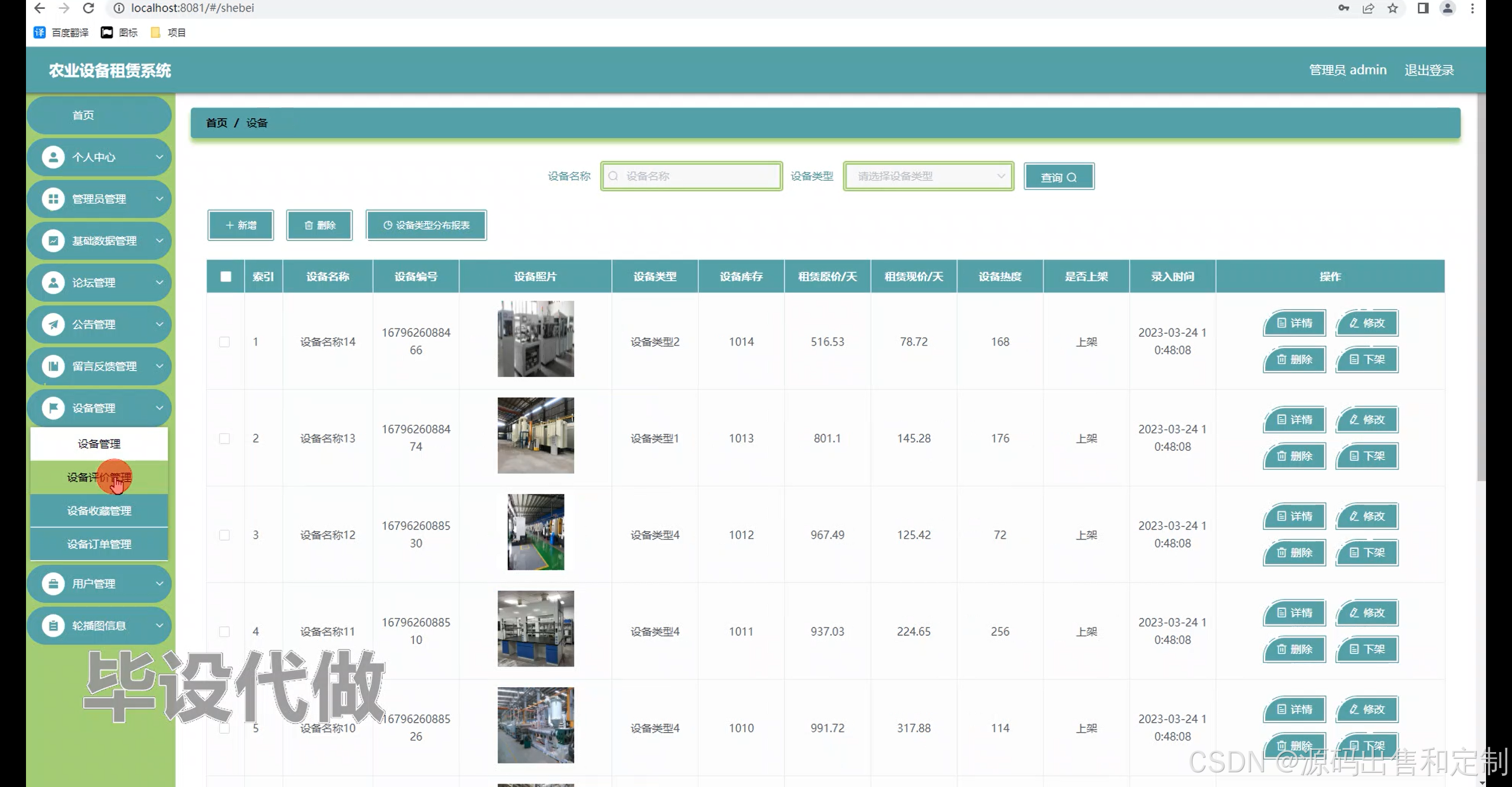 这次开发的农业设备租赁系统对收货地址管理、字典管理、论坛管理、公告管理、留言反馈管理、设备管理、设备收藏管理、设备评价管理、设备订单管理、用户管理、管理员管理等进行集中化处理。具体请看视频演示