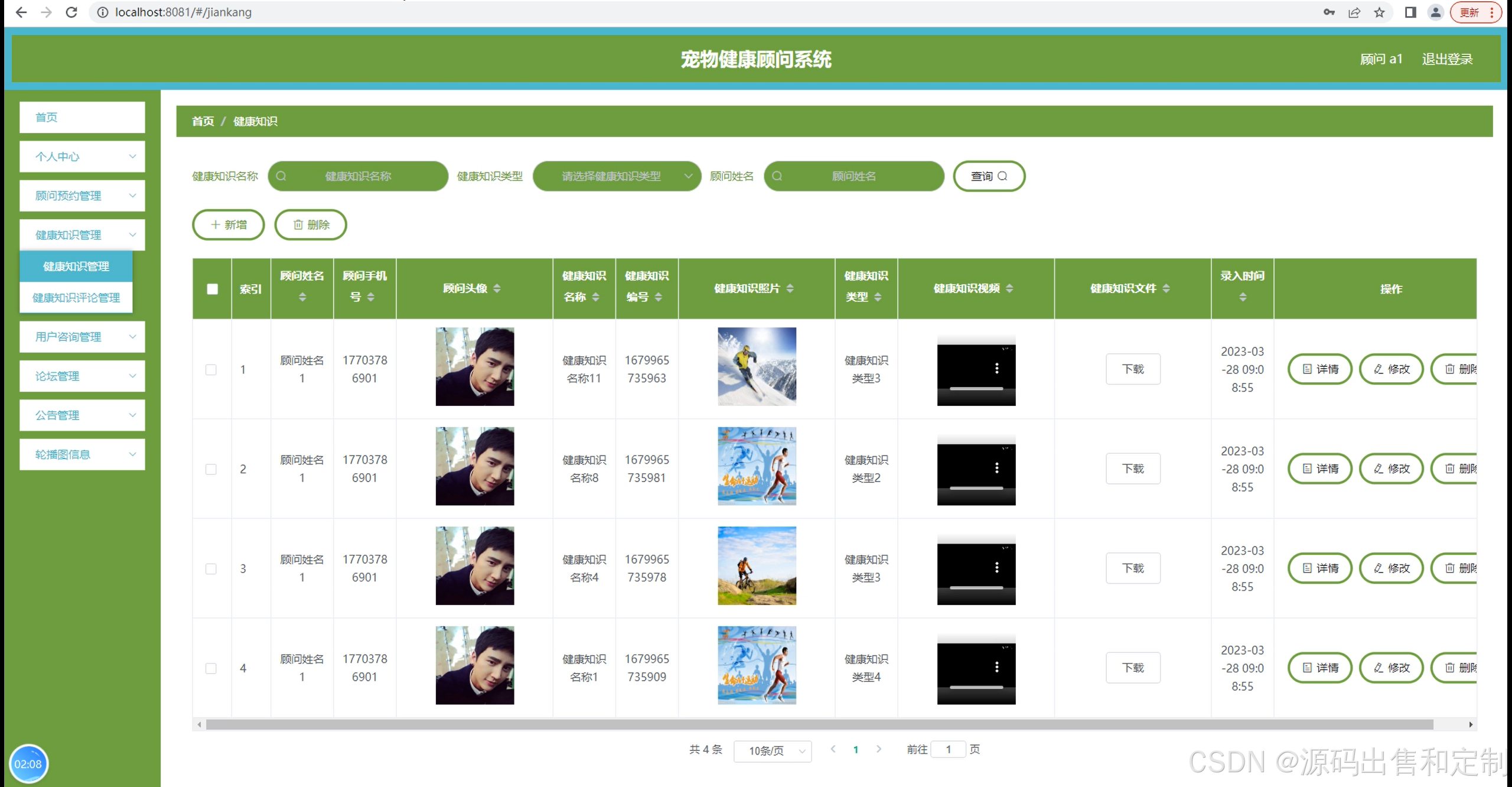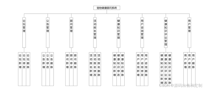 宠物健康顾问系统管理系统按照操作主体分为管理员和用户。管理员的功能包括字典管理、论坛管理、公告管理、顾问管理、活动报名管理、健康知识管理、用户咨询管理、健康知识评论管理、用户管理、管理员管理。具体请看视频演示