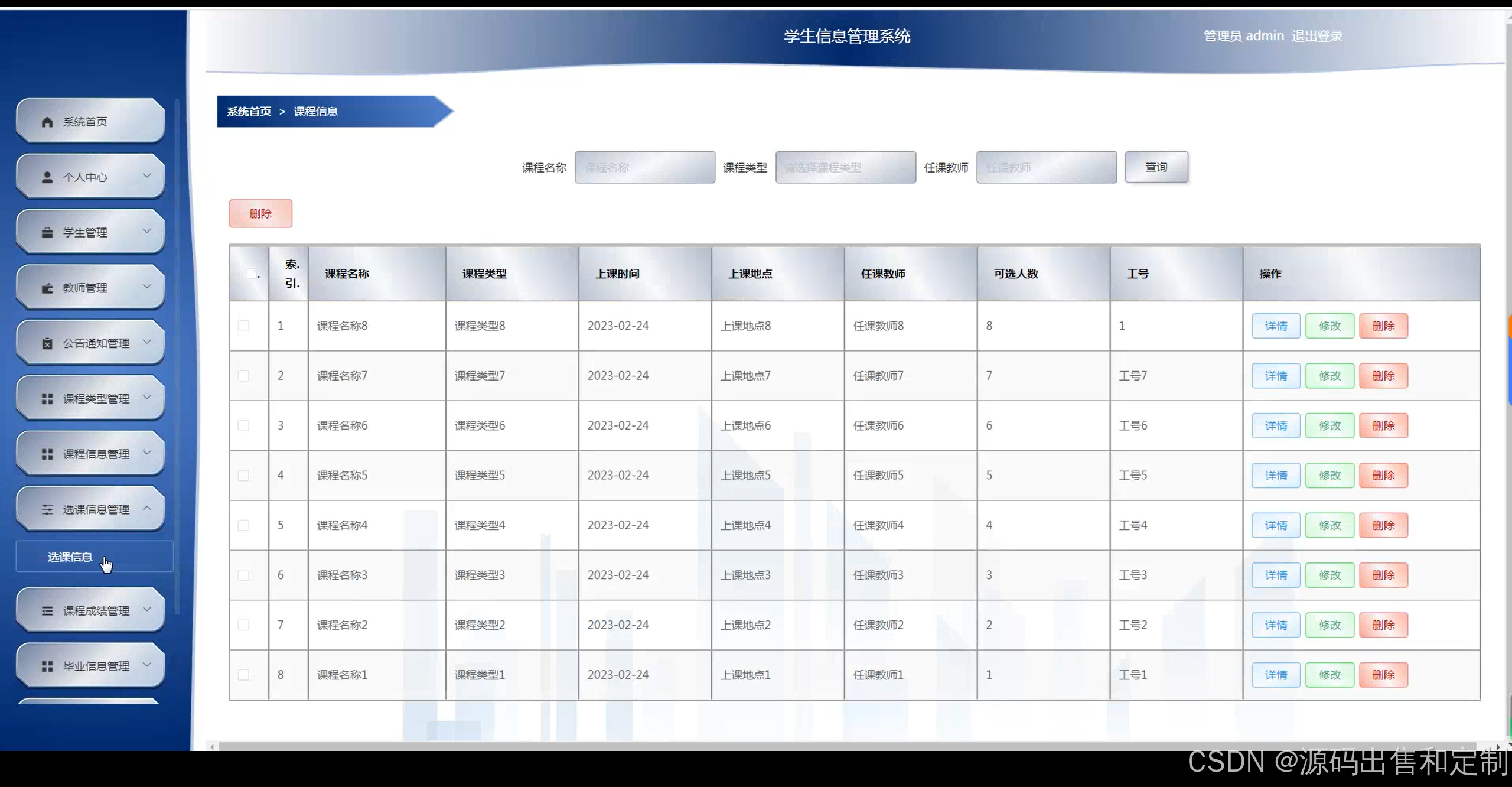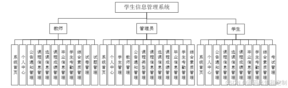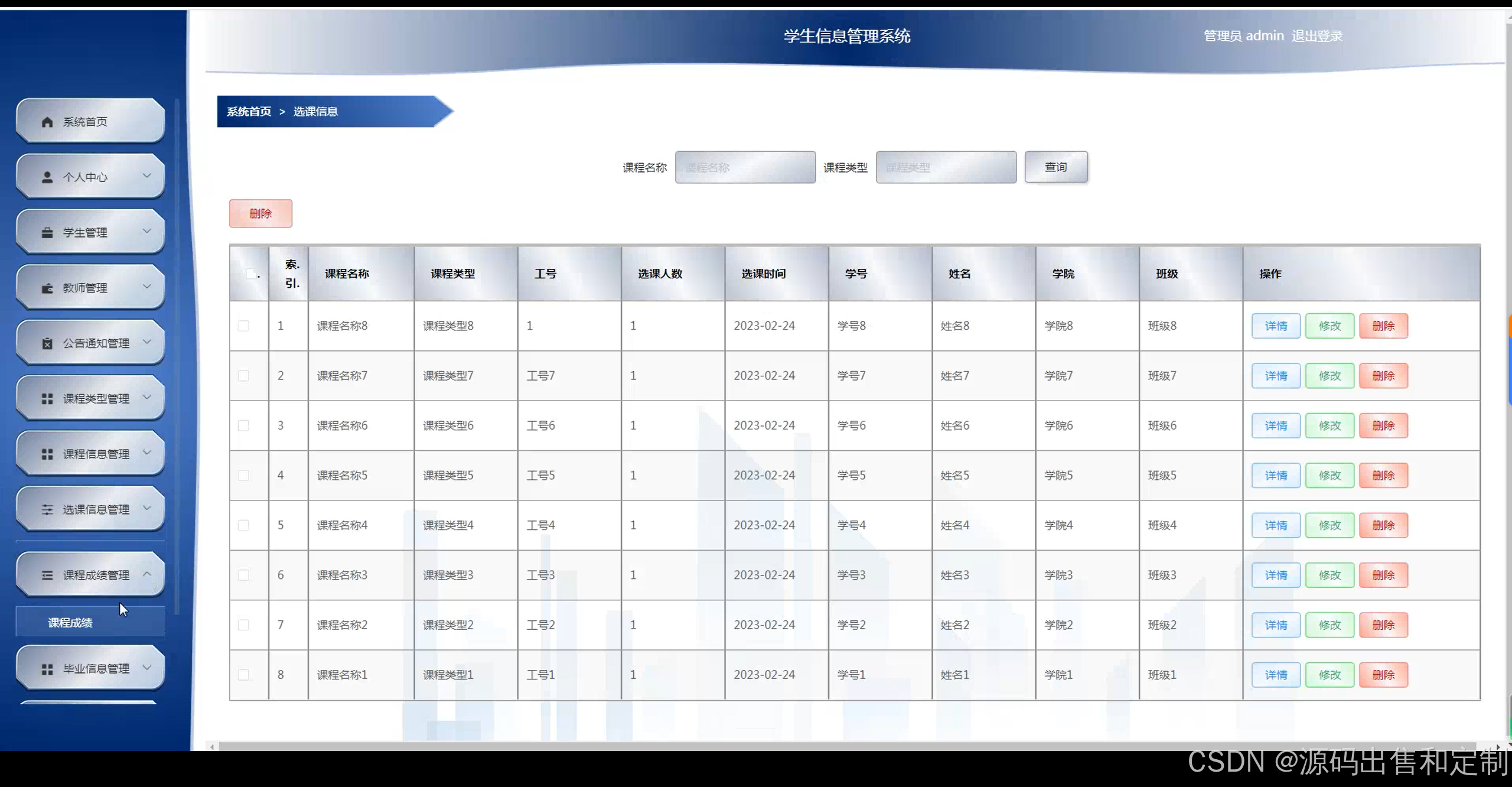 系统主要完成个人中心、学生管理、教师管理、公告通知管理、课程类型管理、课程信息管理、选课信息管理、课程成绩管理、毕业信息管理、学生考勤管理、综合素质管理等功能。具体请看视频演示