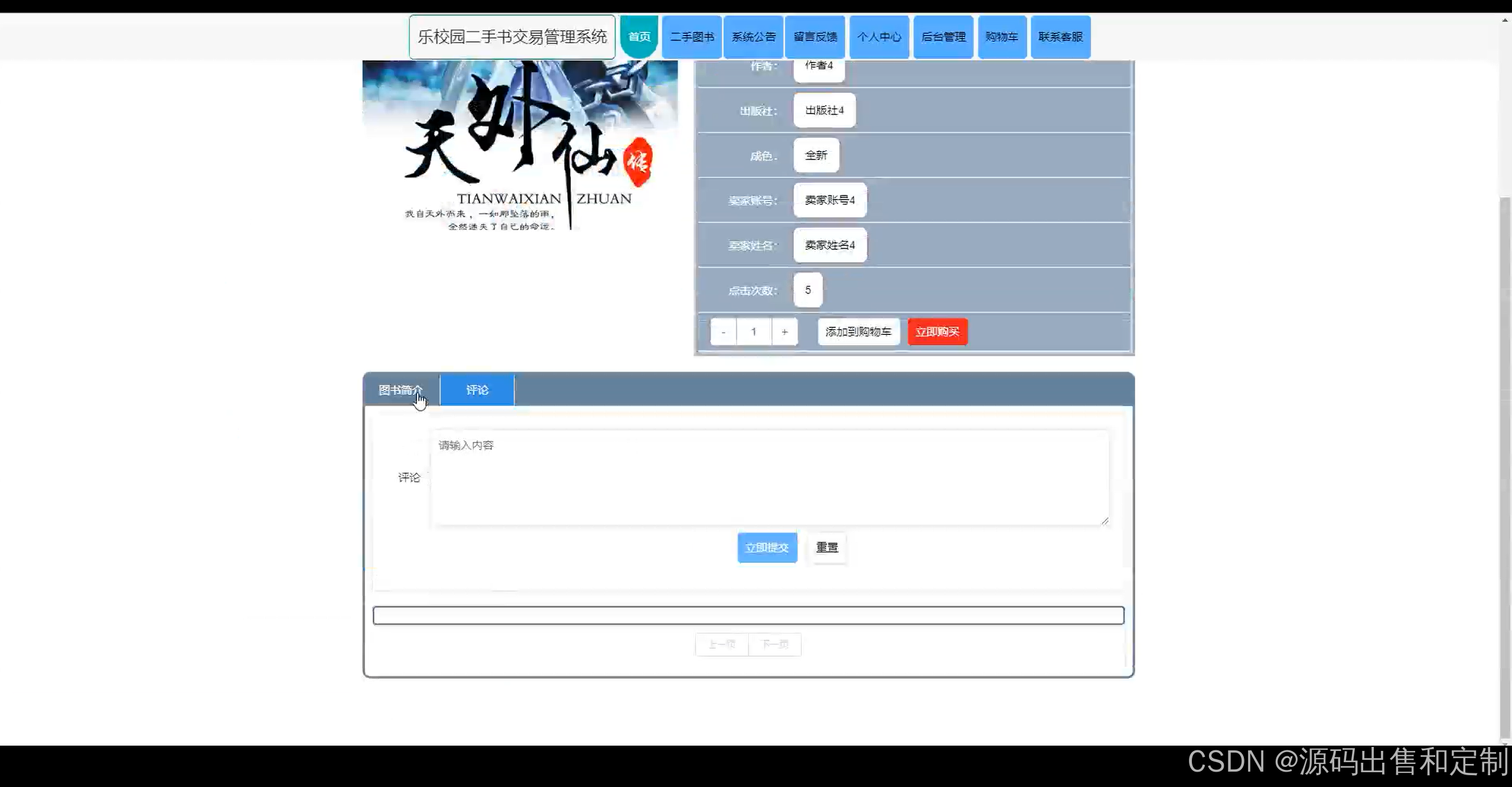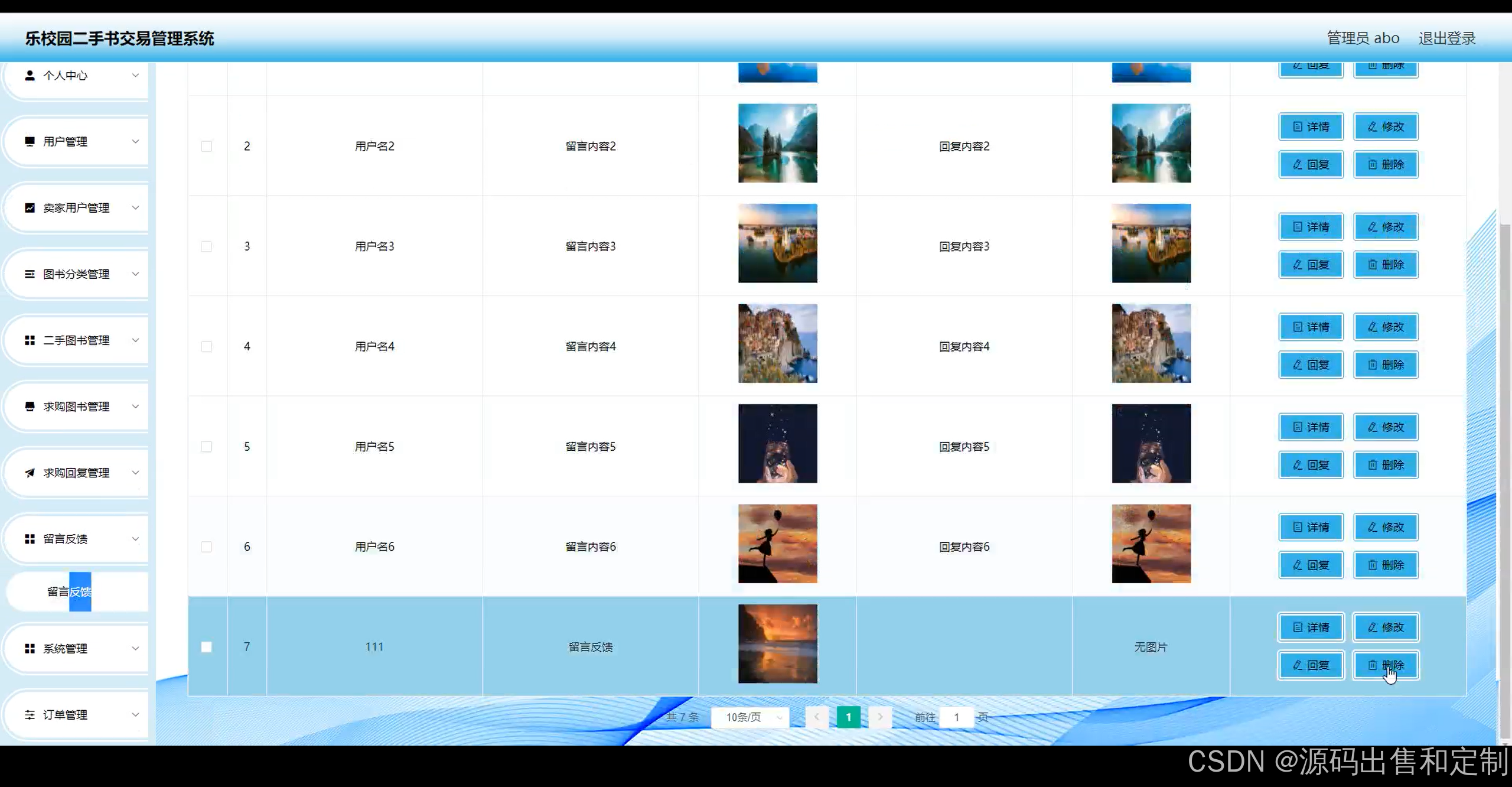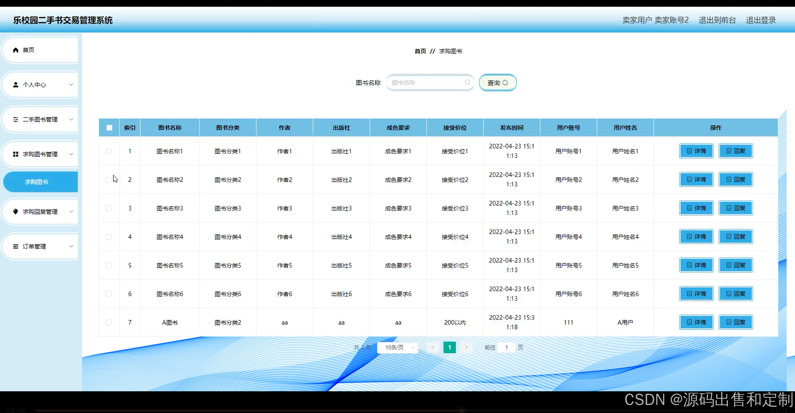 实现了首页、个人中心、用户管理、卖家用户管理、图书分类管理、二手图书管理、求购图书管理、求购回复管理、留言反馈、系统管理、订单管理等内容进行管理,具体请看视频演示