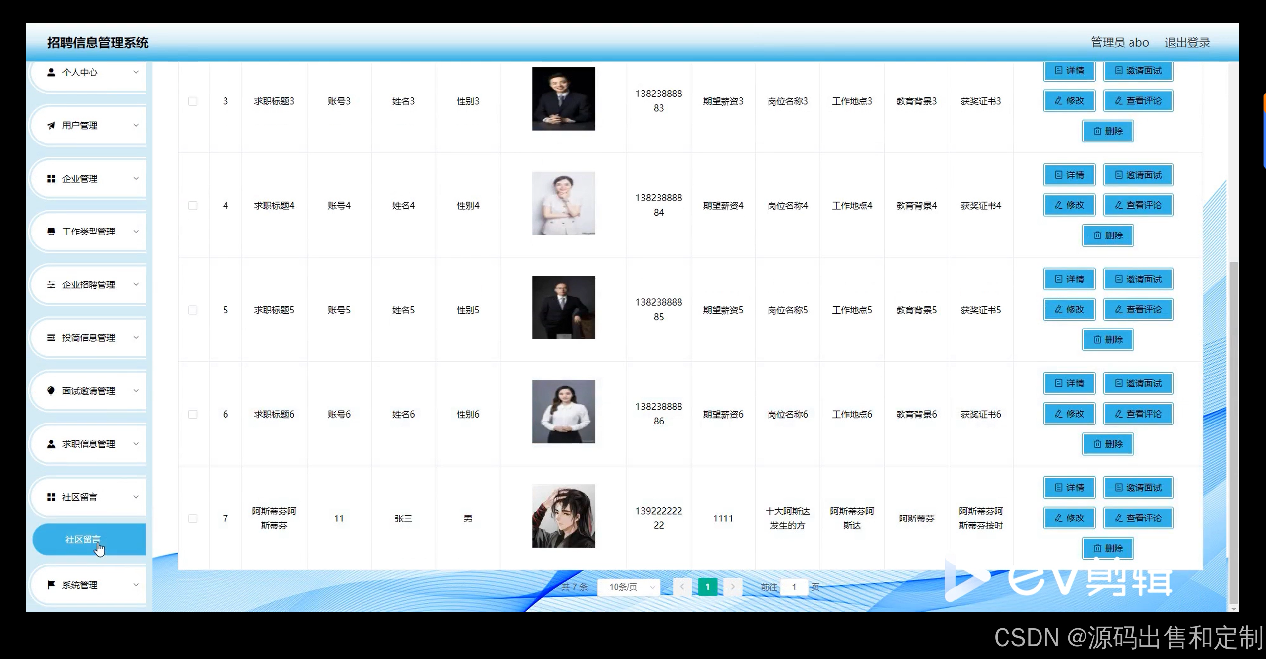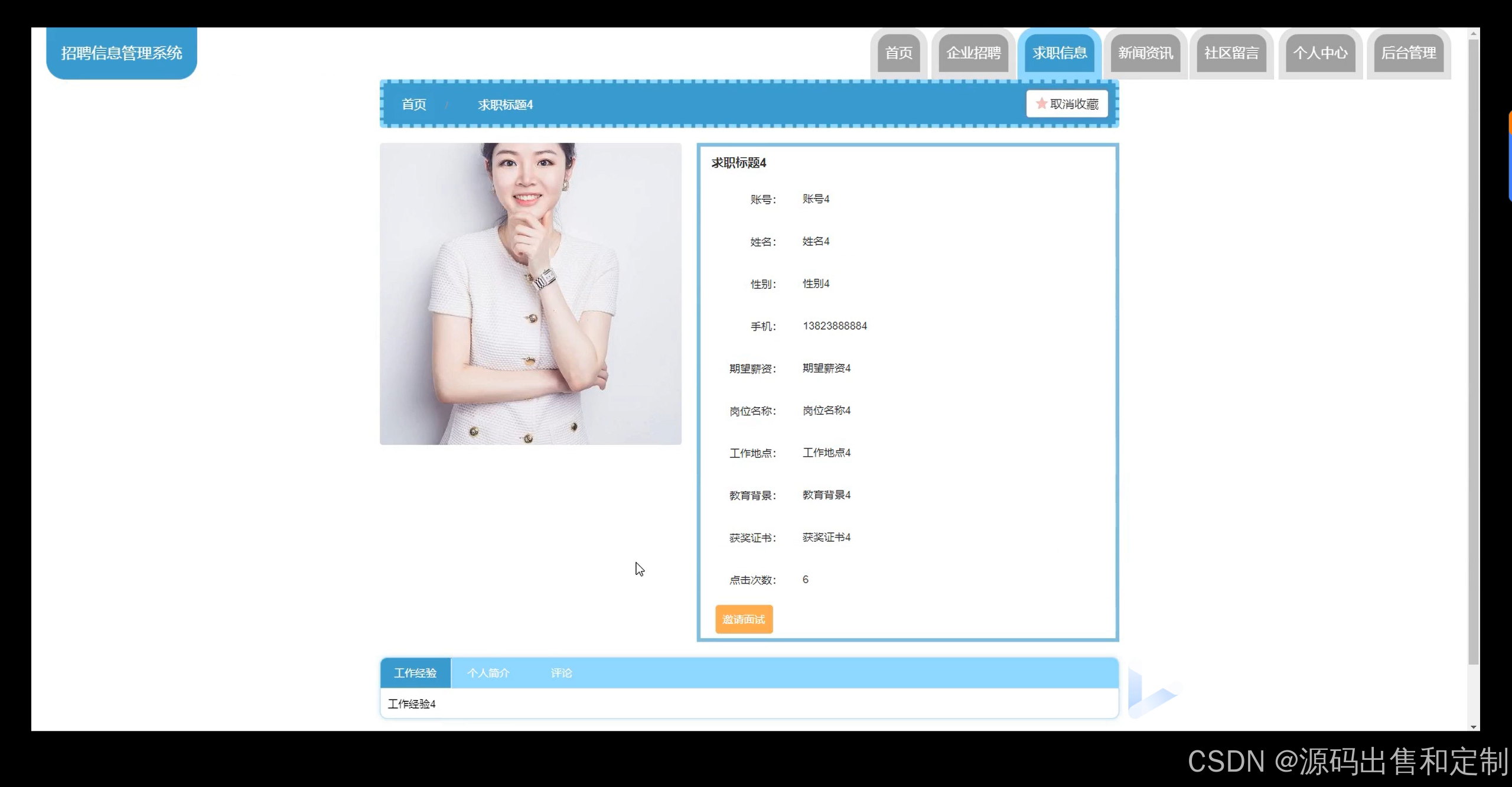 实现了首页、个人中心、用户管理、企业管理、工作类型管理、企业招聘管理、投简信息管理、面试邀请管理、求职信息管理、社区留言、系统管理等内容进行管理,具体请看视频演示