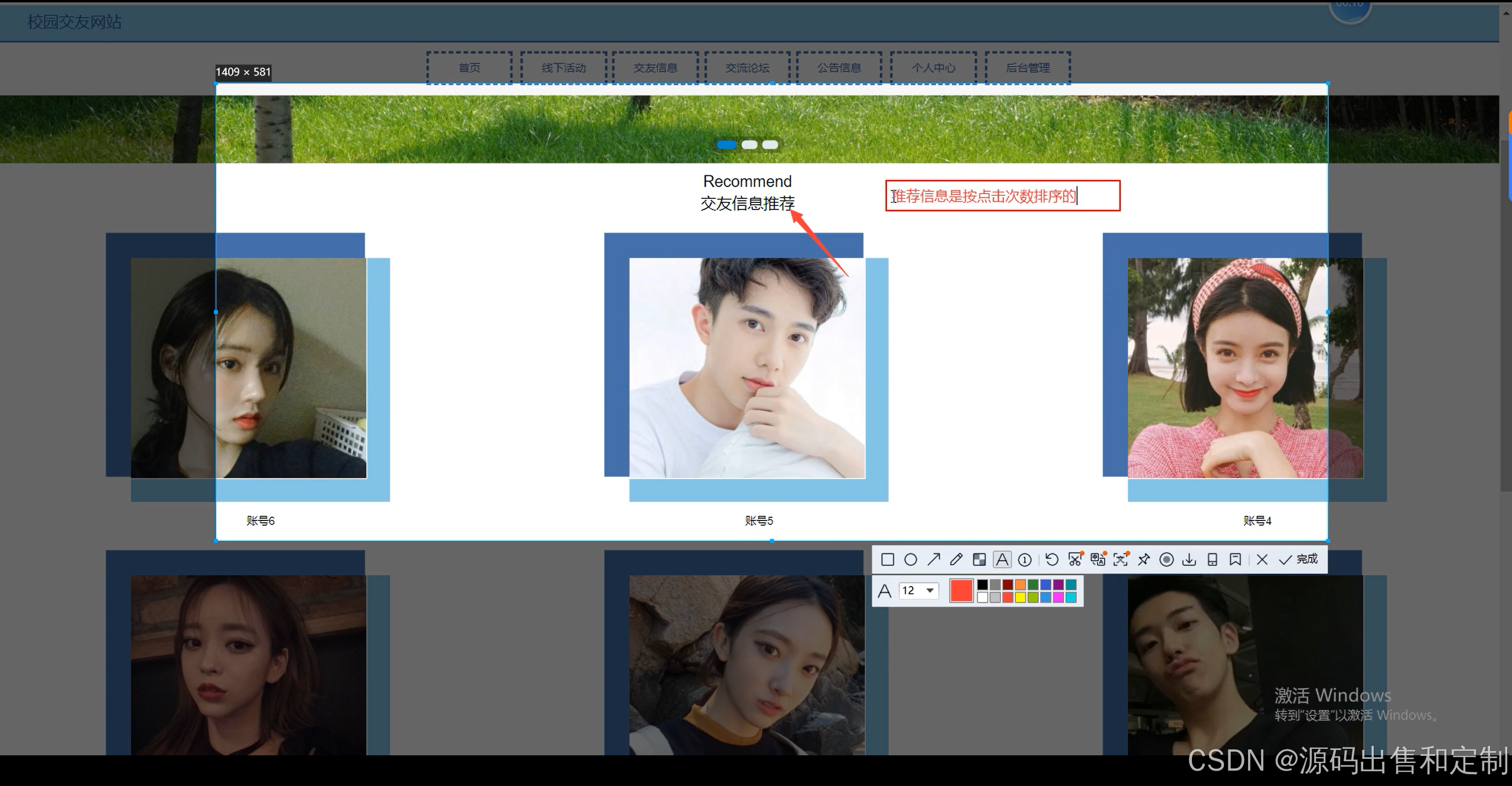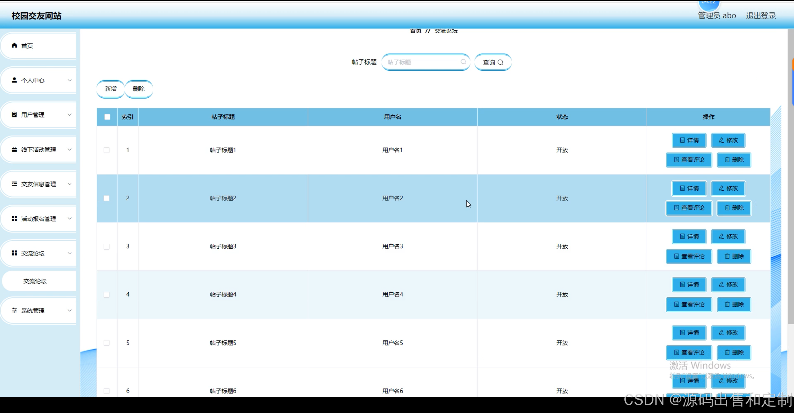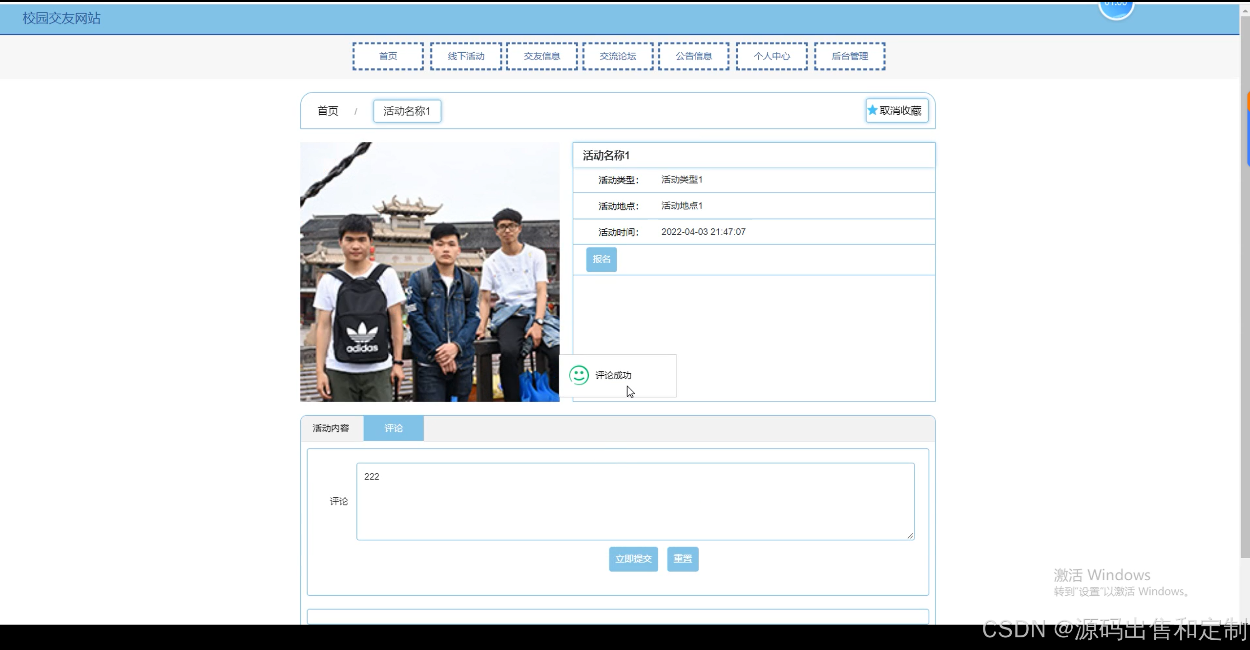 系统主要包括首页、个人中心、用户管理、线下活动管理、交友信息管理、活动报名管理、交流论坛、系统管理等功能模块。具体请看视频演示