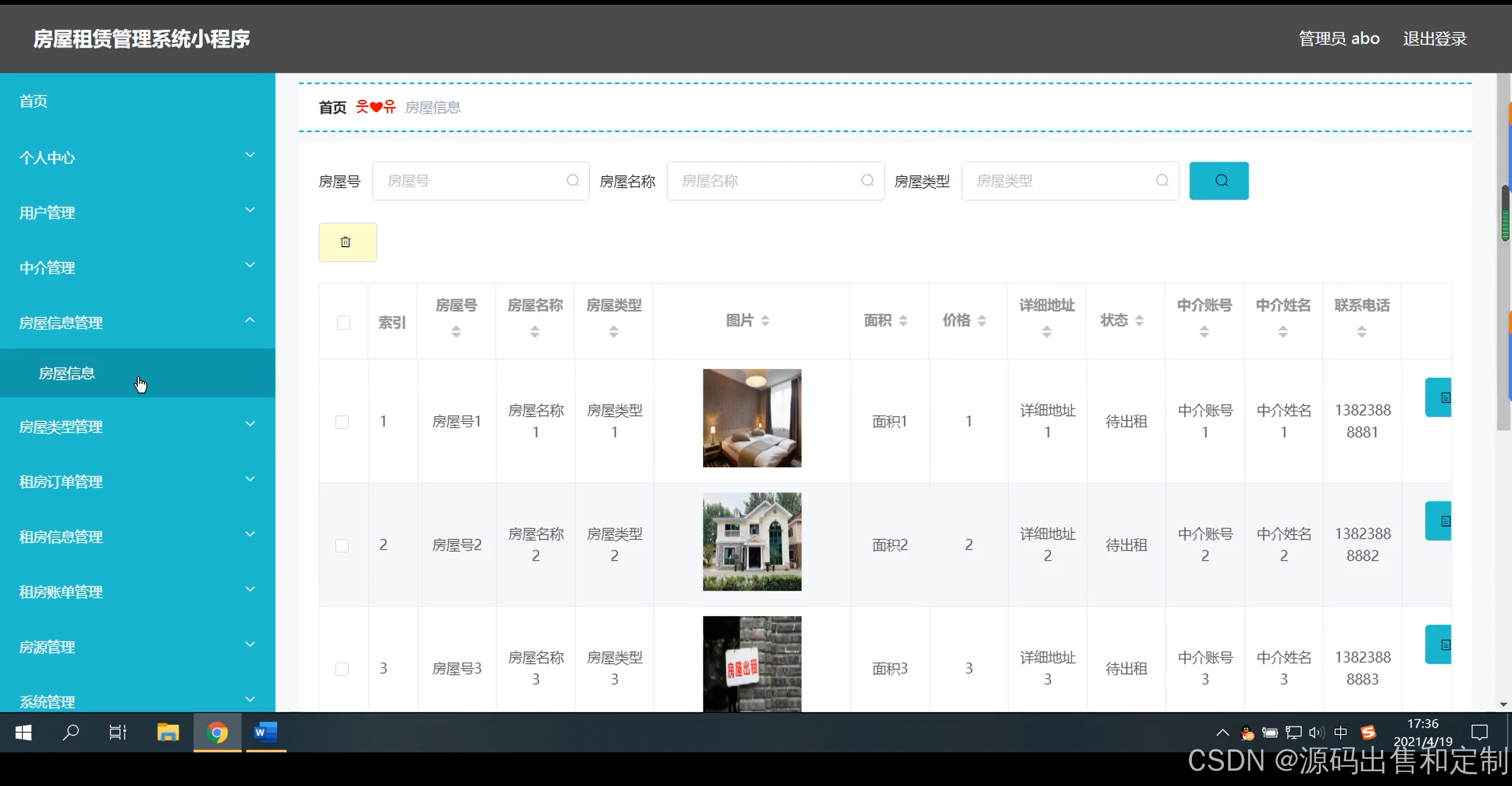 本基于微信小程序的房屋租赁管理系统后端有管理员和中介。管理员功能有,个人中心,用户管理,中介管理,房屋信息管理,房屋类型管理,租房订单管理,租房信息管理,租房账单管理,房源管理,系统管理等。中介功能有,个人中心,房屋信息管理,租房订单管理,租房信息管理等。用户功能有,查看房屋信息,修改个人信息,租房订单,租房信息,租房账单。具体请看视频演示