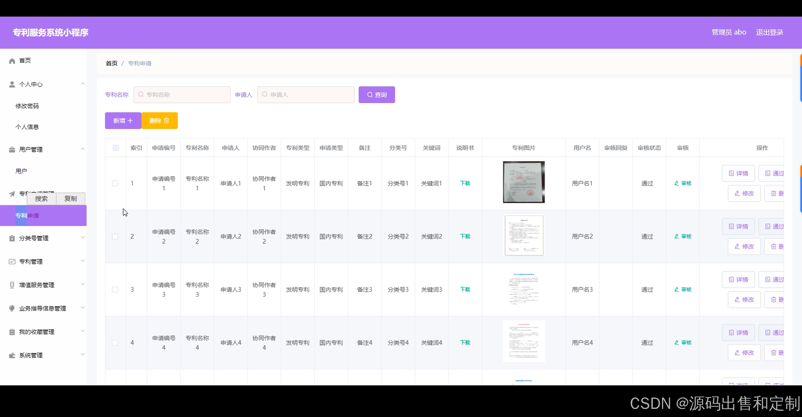 本基于微信小程序的专利服务系统有管理员和用户。管理员功能有个人中心,用户管理,专利申请管理,分类号管理,专利管理,增值服务管理,业务指导信息管理,我的收藏管理,系统管理等。用户可以申请专利相关信息。具体请看视频演示