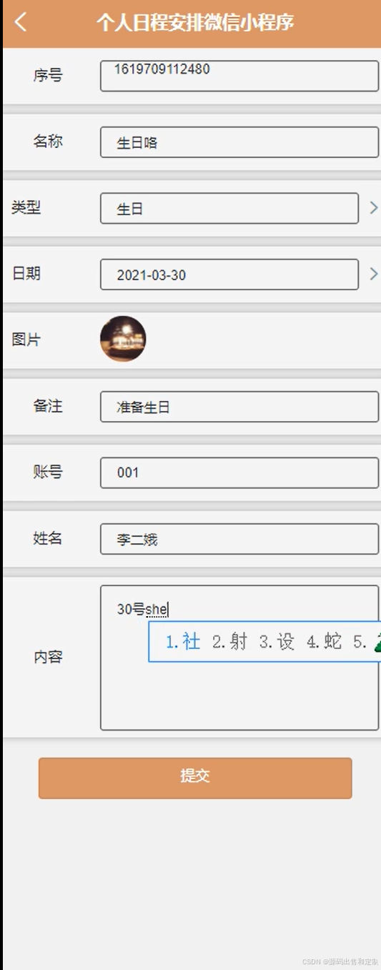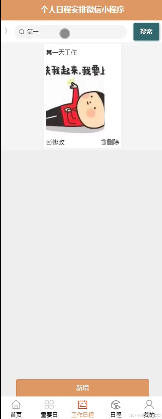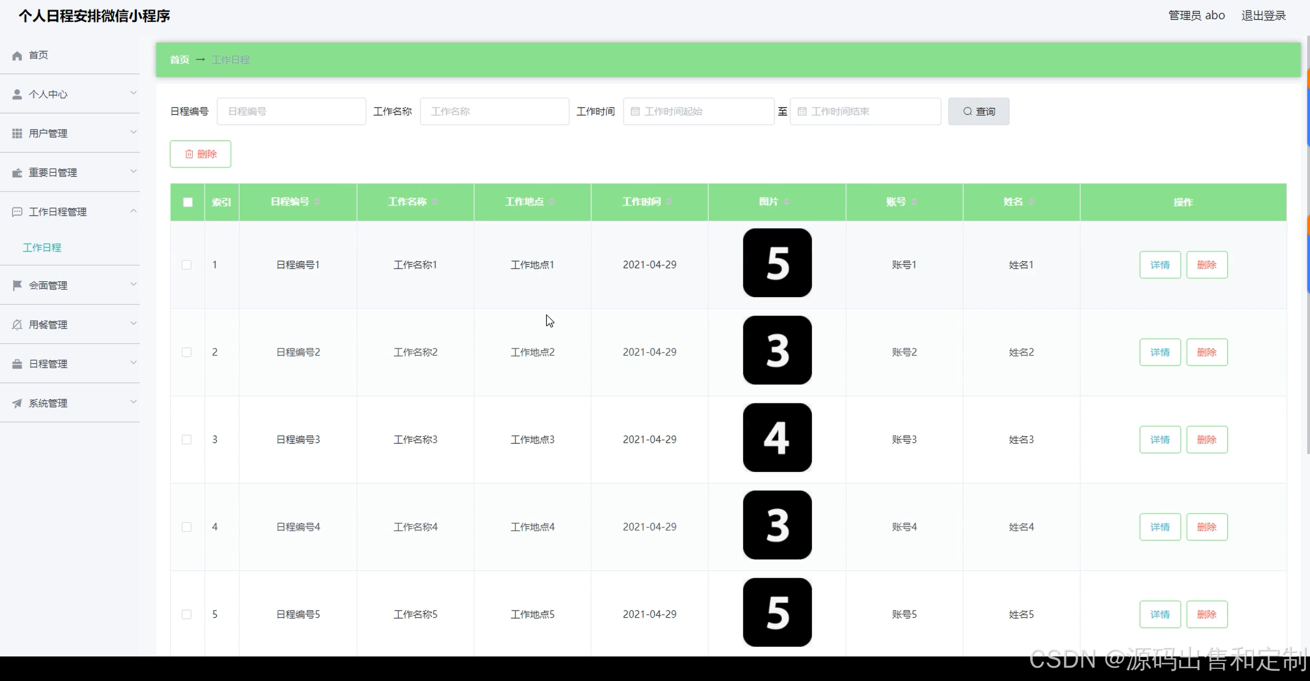 本个人日程安排微信小程序管理员功能有个人中心,用户管理,重要日管理,工作日程管理,会面管理,用餐管理,日程管理,系统管理等。用户可以写自己的相关信息。具体请看视频演示