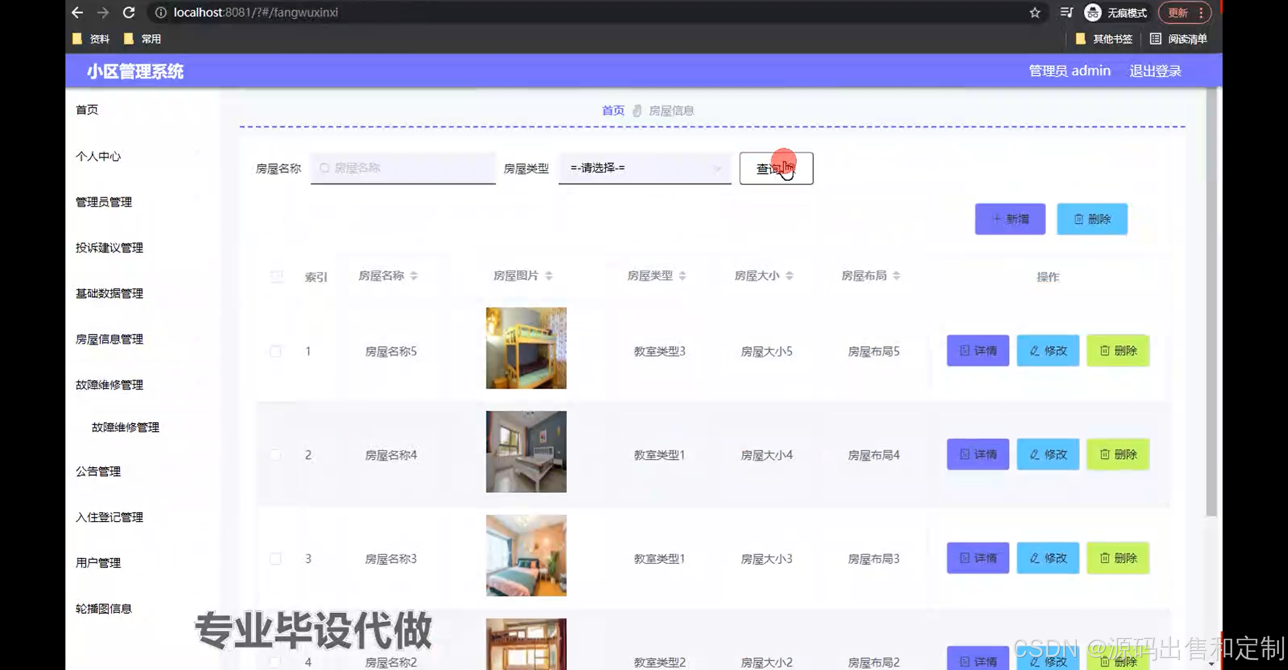 本次开发一套基于微信小程序的小区管理系统,有管理员和用户两个角色。管理员功能有个人中心,管理员管理,用户管理,投诉建议管理,基础数据管理,房屋信息管理,故障维修管理,公告管理,入住登记管理,轮播图信息管理。用户可以注册登录,查看房屋信息,公告信息,增加故障维修,增加投诉建议,增加入住登录等。具体请看视频演示