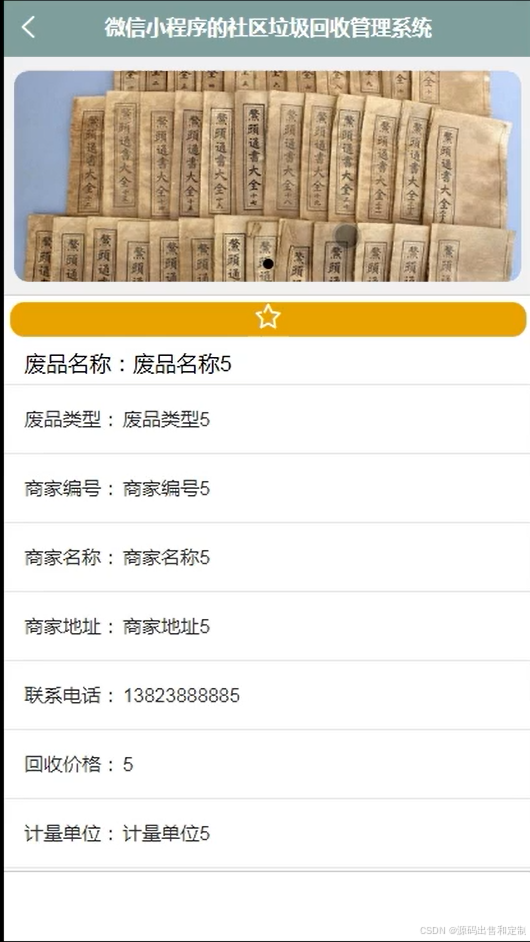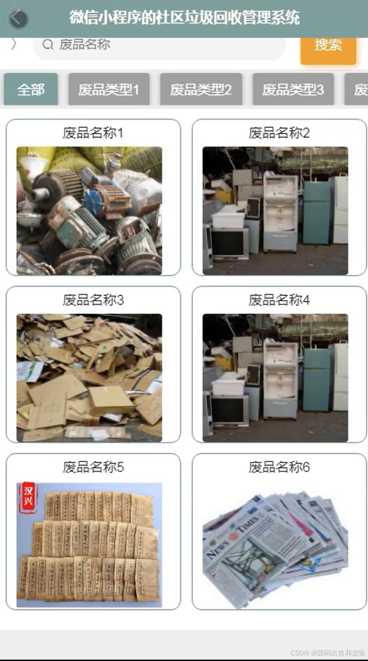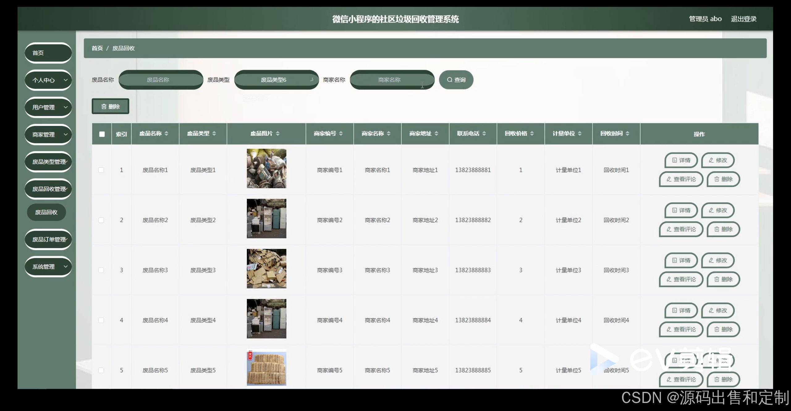 本次开发一套基于微信小程序的社区垃圾回收管理系统,有管理员,回收员,用户三个角色。管理员功能有个人中心,用户管理,回收员管理,废品类型管理,废品回收管理,废品订单管理,系统管理等。回收员和用户都可以在微信小程序注册登录,回收员发布废品信息,用户看到回收员发布的信息后提交自己这边多少,回收员看到订单后会去回收,并且在微信小程序上支付订单金额,还可以审核用户的回复。用户可以看到订单状态是否支付也可以会回收商品进行评论。具体请看视频演示