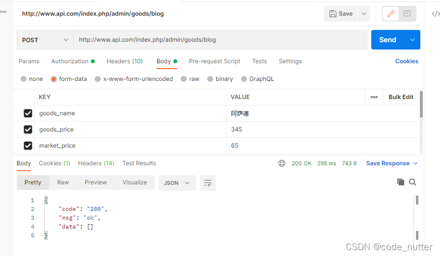 用postMan进行测试 http://www.api.com/index.php/admin/goods/blog