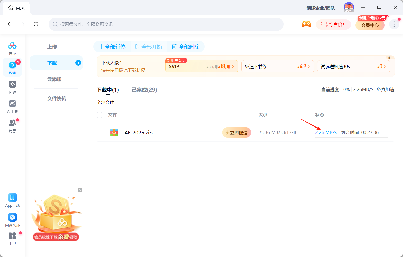OK,这时为了保证功能生效,重启一下百度网盘,这时候下载文件时,就会出现1MB/S的速度了(基本上,但有些时候不稳定)。