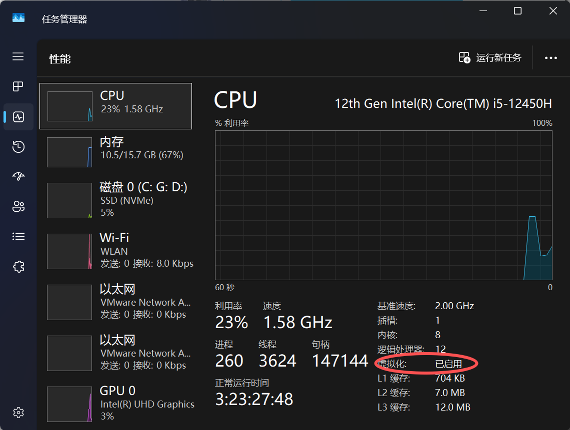 在启用Hyper-V之前,需要确认一个东西是否已经开启,虚拟化开启后才支持Hyper-V的使用,可以在任务管理器里看到