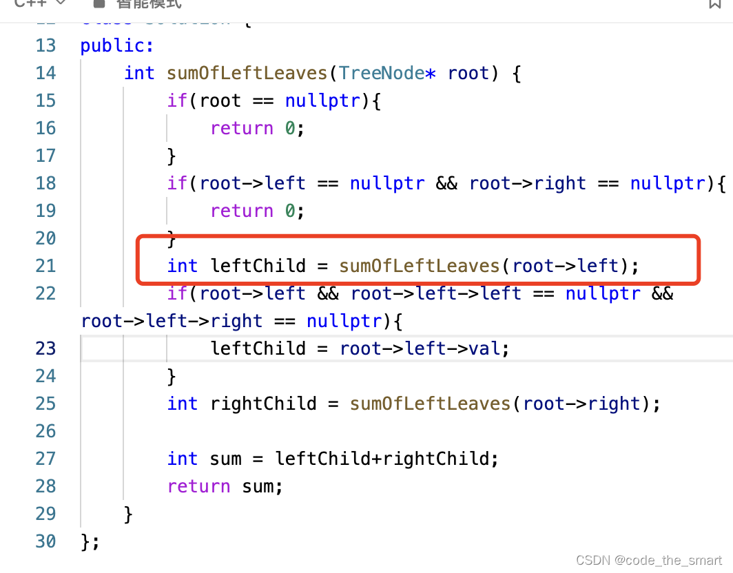 递归逻辑:终止条件时,我要判断左孩子之和,要从父节点出发,所以当某个节点没有叶子节点时,条件终止。