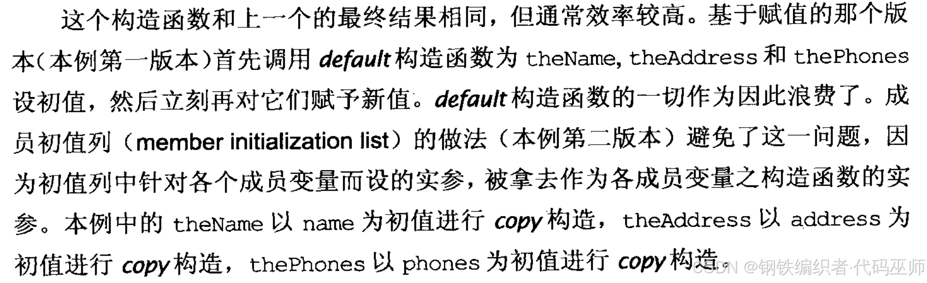 - 提高效率:成员初始化列表直接初始化成员变量,而不是先调用默认构造函数再赋值,避免了重复初始化。