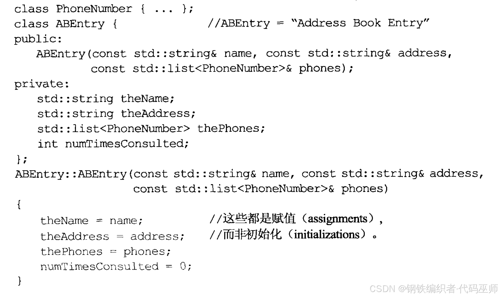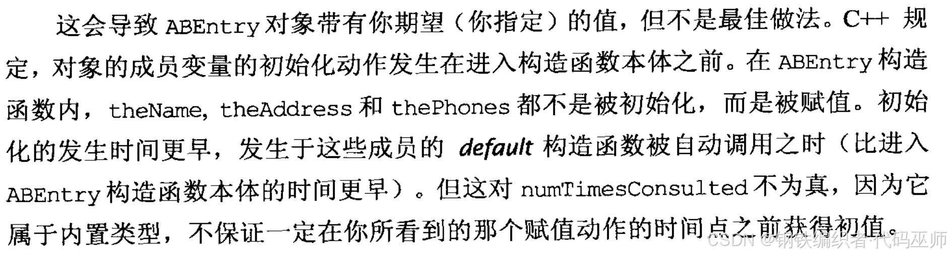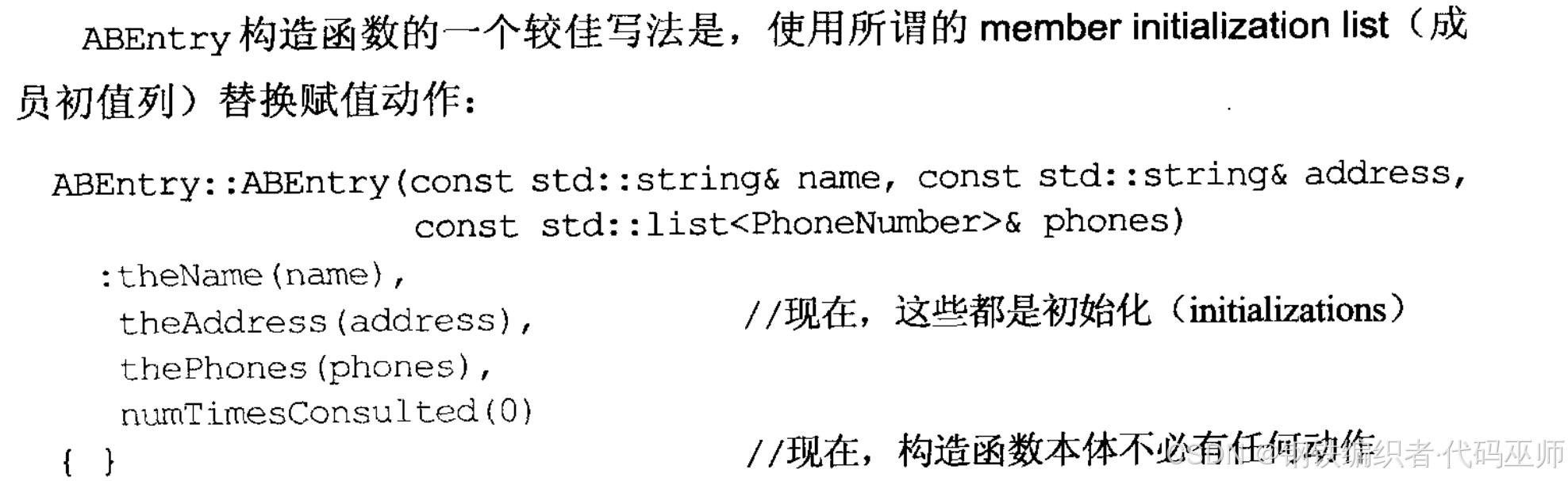 const类型或引用类型成员变量,只能通过初始化列表进行初始化,不能在构造函数体内赋值。 - 更好的习惯:初始化列表可以明确表达初始化意图,特别是对指针或自定义对象类型。